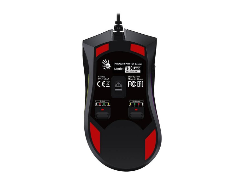 A4tech BLOODY W90 Pro Activated, herná myš s RGB podsvietením, 16000 DPI, čierna, USB - Optická herná myš RGB pre profesionálnych a amatérskych hráčov počítačových hier - Rekordný čas odozvy len 1 ms - Optický senzor PMW3389 - Rozlíšenie 50-16 úchopy (pazúr/prsty/dlaň) - Pogumované bočné strany s textúrovanými úchopmi, ktoré zabraňujú skĺznutiu a poteniu - Garantovaná životnosť 50 miliónov kliknutí - 8 tlačidiel vrátane presného rolovacieho kolečka a 3 horných tlačidiel na prepínanie režimov streľby: o 3 Shot - 6 výkonných režimov odstreľovania - Kovové dráhy s technológiou Metal X'Glide Armor Boot eliminujú trenie na takmer akomkoľvek povrchu pre plynulejšie ovládanie, presné pohyby kurzora a väčšiu presnosť - Vstavaná 4MB pamäť umožňuje používať myš bez potreby ovládača a uložiť až 120 000 ma podsvietením - Podsvietenie RGB LED (16,8 milióna farieb) a 5 prednastavených režimov: o RGB o Biela padajúca hviezda o Striedanie červenej a zelenej farby o Červeno-žltý cyklus o Viacfarebný gradient - Jedinečné prepínanie režimu RGB jednoduchým zdvihnutím myši a potvrdením horným tlačidlom Prepínanie medzi 4 hernými režimami (Core1 a Core 2 zadarmo, Ultra-Core3 a UltraCore4 placené verzie) o Funkčnosť tlačidiel nastaviteľná užívateľom na ľubovoľnú funkciu o Uložiť 3 užívateľské profily tlačidiel (Standard, Gaming2 a Gaming3) o Zmena rýchlosti hlásenia o Zmena DPI o Z ms o Zmena intenzity podsvietenia v 4 úrovniach vrátane úplného vypnutia - Software "Bloody 7" je na stiahnutie zadarmo (https://www.bloody.com/en/download.php?id=6) - Technológia LOD (Lift Off Distance): o Vyhodnocuje a zvyšuje polohu o možnosti nastavenia (1,5/2/3 mm, P) - Snímková frekvencia: 12 000 snímok za sekundu - Zrýchlenie: 50 G - Rýchlosť sledovania: 400 ips - Nastaviteľná rýchlosť hlásenia: 125/500/1000/2000 Hz - Vysoká presnosť ideálna aj Konektor USB-A - Univerzálna kompatibilita operačných systémov Windows 7 a vyšších - Dĺžka kábla: 180 cm - Rozmery (d × š × v): 127 × 68 × 44 mm - Hmotnosť vrátane kábla: 146 g - Hmotnosť bez kábla: 109 gDodatočné parametre