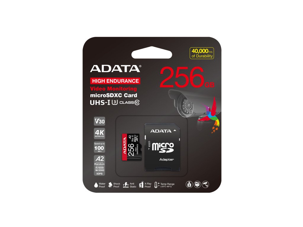 Pamäťové karty ADATA High Endurance microSDXC/SDHC UHS-I sú pamäťové karty s vysokou odolnosťou a rýchlosťou videa triedy 30 (V30), ktoré sú špeciálne navrhnuté na nepretržité nahrávanie a nepretržité prehrávanie. Sú ideálne pre kamery do auta a monitorovacie systémy. Okrem toho vďaka klasifikácii Application Performance Class 2 (A2) môžu používateľom poskytnúť rýchlejšie a plynulejšie aplikácie. Karty microSDXC/SDHC UHS-I, ktoré sú vyrobené s vysokokvalitnými čipmi NAND Flash a navrhnuté s ohľadom na odolnost, vydržia až 80 000 hodín záznamu videa. Skalopevná stabilita zabezpečuje nepretržité nahrávanie deň za dňa, vďaka čomu je každý okamžik uložený a kľúčové zábery nikdy neuniknú. Funkcie Navrhnuté na nepretržité nahrávanie a neustále prehrávanie Spĺňa nové špecifikácie UHS-I U3 Kvalifikácia A2 - pomáha rýchlejšie inštalovať a spúšťať aplikácie Trieda rýchlosti videa V30: dokáže zaznamenať minimálne 30 MB videa za sekundu Rozlíšenie Full HD 1080p a Ultra HD 4K Odolnosť: vodotesnosť, nárazuvzdornosť, antistatická odolnosť, odolnosť voči rentgenovému žiareniu a široká podpora teplôt (-25 °C až 85 °C). Špecifikácia Rýchlosť čítania: až 100 MB/s Rýchlosť zápisu: až 85 MB/s Rozmery (D x Š x V): 15 x 11 x 1 mm Hmotnosť: 0,25 gDodatočné parametre