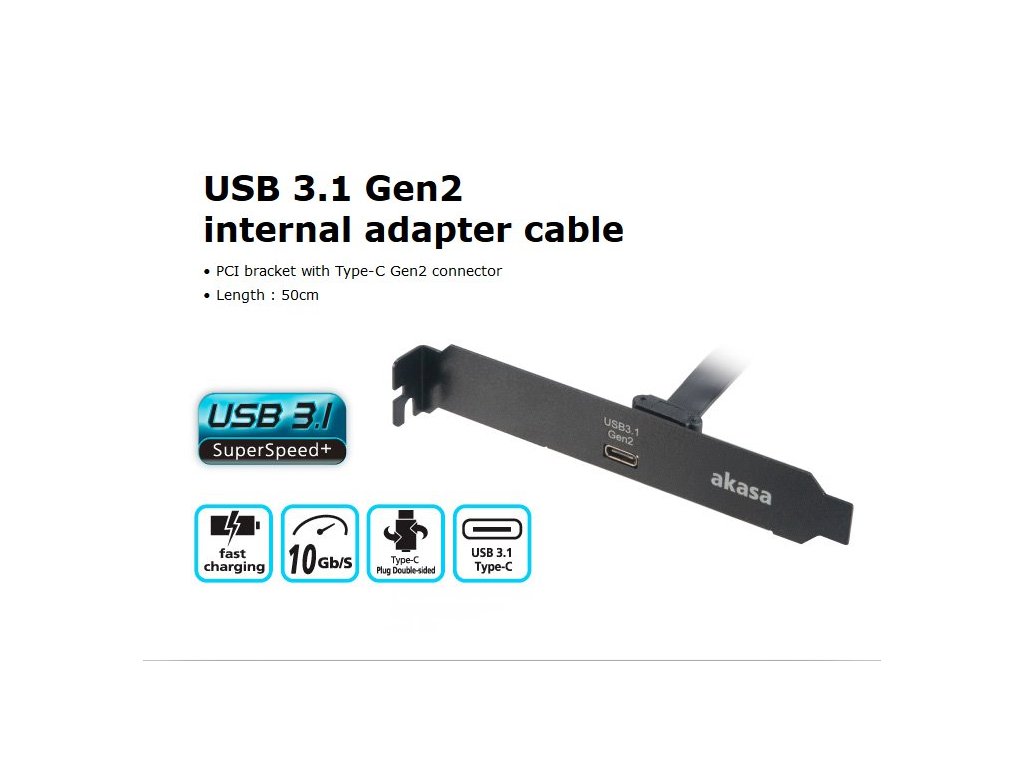 Akasa AK-CBUB37-50BK Pomocou tohto držiaka rozšírite konektorovú výbavu svojho počítača o jeden moderný port USB 3.1 Gen2 typu C. Ten zabezpečí rýchle dátové prenosy až do rýchlosti 10 Gb/sa rýchle nabíjanie pripojených zariadení. Inštaluje sa do zadnej pozície PCI v šasi a pripája sa pomocou 50 cm dlhého kábla k príslušnému konektoru základnej desky. ZÁKLADNÉ ŠPECIFIKÁCIE Konektory: 1x USB 3.1 Gen2 Type-C Dĺžka kábla: 50 cmDodatočné parametre