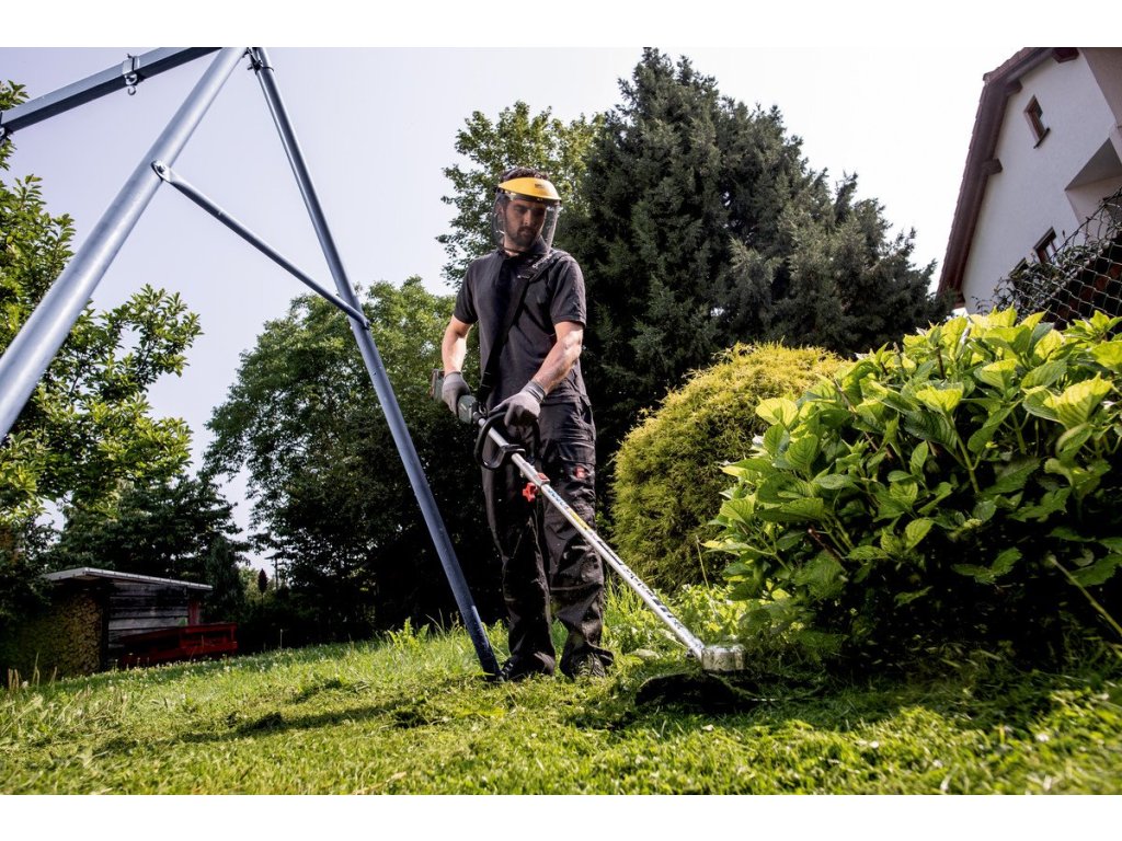 Jednoduchá preprava a priestorovo úsporné skladovanie vďaka dvojdielnemu hriadeľu s rýchlospojkou Jednoduchá zmena polohy struny krátkym poklepaním na knoflík cievky počas práce Rýchla výmena nití Metabo: rýchla a bez použitia náradia, bez nutnosti demontáže alebo otvárania cievky Výkonný bezuhlíkový motor Plynulá regulácia otáčok na flexibilnú prácu Sklopný ochranný rám na udržiavanie vzdialenosti od stromov, kríkov alebo iných prekážok Bezpečná práca vďaka pogumovaným úchopovým bodom a prídavnému bezpečnostnému spínaču Odolný a robustný vďaka kovovému krytu motora a ochrane akumulátora proti nárazu Správne držanie tela prostredie a tichý vďaka akumulátorovej prevádzke, takže sa môže používať aj v zónach citlivých na hluk Mnoho značiek, jeden bateriový systém: tento výrobok možno kombinovať so všetkými 18 V akumulátormi a nabíjačkami od CAS: www.cordless-alliance-system.com Technické údaje Napätie akumulátora 18 V Priemer rezu 30 cm Vo0 mm Rukoväť Kruhová rukoväť Hmotnosť bez akumulátora 3,4 kg Hladina akustického tlaku 76 dB(A) Hladina akustického výkonu (LwA) 87 dB(A) Nejistota merania K 3 dB(A) Hmotnosť vrátane akumulátora 3,8 kg Voľnobežná rýchlosť 3,5 m/s Kruhová rukoväť Ramenný popruh Ochranný kryt Dvojitá cievka na struny (O 2 mm struny, 4 m) Šestihranný kľúč Krížový skrutkovač bez akumulátora, bez nabíjačkyDodatočné parametre