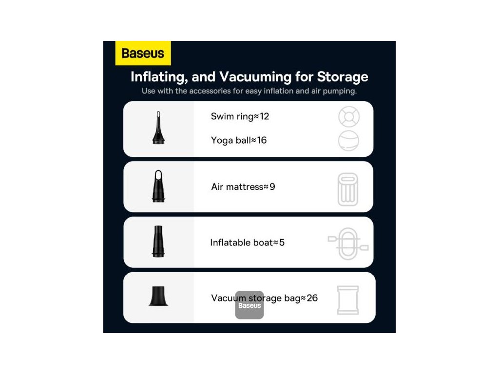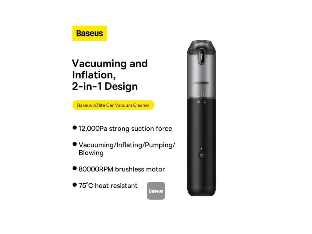 Vysávač do auta s mega sacou silou 12 000pa: Ručný vysávač Baseus využíva vylepšený systém pohonu pre silnejší výkon, poskytuje vysokorýchlostné konštantné prúdenie vzduchu a udržuje vynikajúci sací výkon počas celého procesu vysávania. Malý vysávač 4 v 1 s viacnásobným využitím: Je to vysávač, vzduchová pumpa, nafukovačka a dúchadlo v jednej konštrukcii. Dodáva sa so 4 univerzálnymi hubicami, ktoré sú vhodné pre väčšinu malých a veľkých nafukovacích výrobkov, ako sú nafukovacie matrace, nafukovacie postele, bazénové plaváky, podložky na spanie, plavecké kruhy, nafukovací nábytok, nafukovacie predmety do bazéna a iné nafukovacie hračky. Výkonný a zároveň tichý motor. Praktický vysávač: Jedným kliknutím sa veko nádoby na prach automaticky otvorí, takže si pri vysypávaní prachu dovnútra nezašpiníte ruky, čo je premyslené a veľmi pohodlné. Ultra tenký a ľahký dizajn s hmotnosťou 0,96 lb: Bezdrôtový dizajn s tenkou a ľahkou konštrukciou ponúka prenosný vysávač Baseus pohodlné uchopenie a jednoduchšie ovládanie, bezbolestné dlhodobé používanie, už nie je viazaný elektrickou zásuvkou. Pripomíname: Môže dôjsť k náhlemu zastaveniu v dôsledku upchatia filtra. Pravidelným poklepávaním čistite prach vo vnútri filtra HEPA a po určitom čase používania filter HEPA vymeňte. Perfektný výber darčeka: Vysávač do auta Baseus má vynikajúce a kompaktné balenie, prémiový vzhľad, vhodný na čistenie auta, kuchyne, kobercov, ložnice, perfektný výber darčeka na Vianoce, Valentína, Back to Shool. Špecifikácia Názov Vysávač do auta Baseus A3 Lite Sací výkon 100AW/12000PADodatočné parametre
