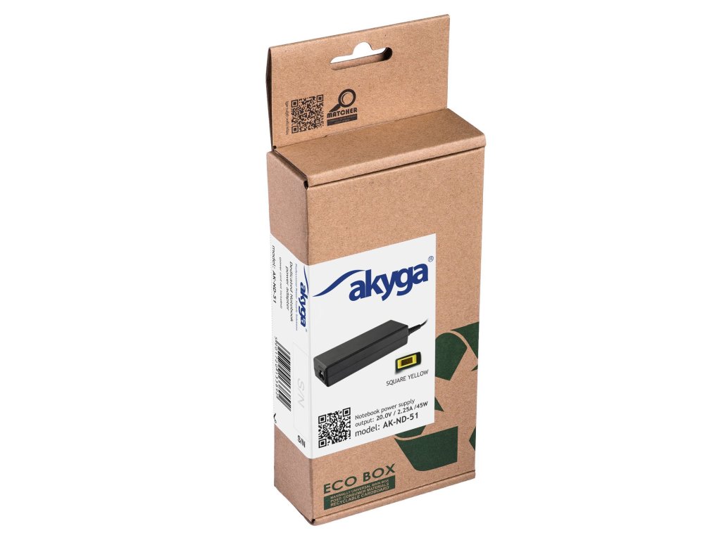 Napájací zdroj AK-ND-51 20V / 2,25A 45W Slim Tip Akyga® AK-ND-51 je 45W napájací adaptér kompatibilný s akýmkoľvek notebookom s 20V, až 2,25A napájaním a konektorom Slim Tip (známym aj ako Square Yellow). Kabel napájacieho adaptéra je vybavený vysokokvalitným feritovým jadrom, ktoré zabraňuje a chráni zariadenie pred akýmkoľvek možným režimovým preudom a vysokofrekvenčným šumom. Súbor ochran (OVP, OTP, OPP, SCP a OCP) zaručuje 100% bezpečný a stabilný prevádzku napájaného zariadenia a zdroja napájania. Vysoká účinnosť viac ako 80% zabezpečuje efektívne napájanie. Dodatočnú bezpečnosť zariadenia zaisťuje technológia mäkkého startu, ktorá neutralizuje náraz prvého úderu prúdu počas startu zariadenia.Dodatočné parametre