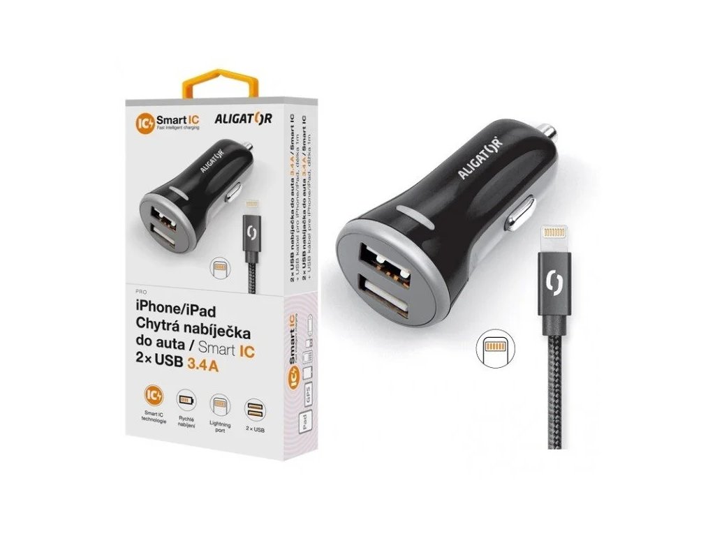 Múdra nabíjačka do auta ALIGATOR 3.4A, 2xUSB, smart IC, čierna, USB kábel pre iPhone / iPad Nová výkonná nabíjačka do auta radu „SMART IC“ v čiernom prevedení, dvoma USB portami s výstupnou kapacitou 3.4A. Táto nabíjačka je ideálna pomocníkom na dobíjanie mobilného telefónu a iných zariadení prostredníctvom cigaretového zapaľovača. Múdra nabíjačka zvládne doplniť energiu až dvom prístrojom naraz, navyše je vybavená šikovným čipom pre rýchle nabíjanie. Až 5x rýchlejšie nabíjanie oproti bežnej USB nabíjačke. Funkcia Smart IC automaticky detekuje typ pripojeného zariadenia a prispôsobí nabíjací prúd a napätie tak, aby sa nabilo čo najrýchlejšie. Kompatibilné s väčšinou zariadení s USB portom. Súčasťou balenia je USB kábel pre iPhone/iPad (Lightning port) 2A Technické údaje: • Vystup: DC 12-24V • Výstup: DC 2x5V 2.4A (max 3.4A celkom) • SMART IC – rýchle adaptívne nabíjanie • Ochrana proti skratu a preťaženiu • USB kábel pre iPhone/Dodatočné parametre