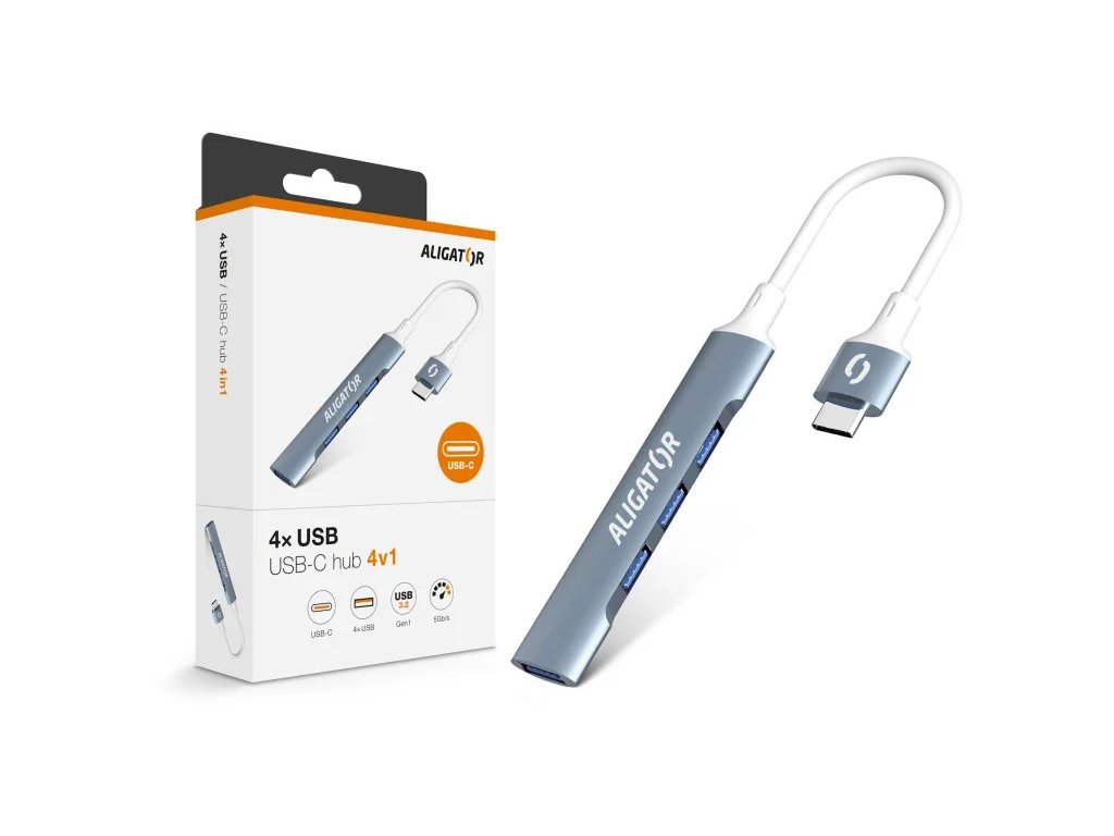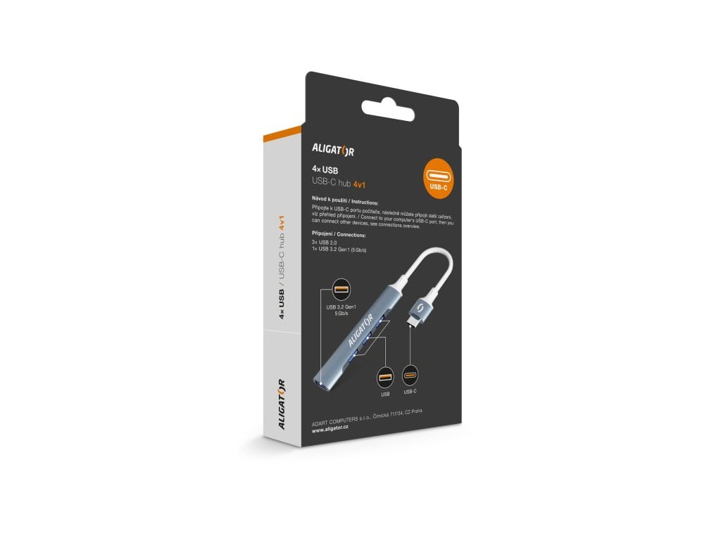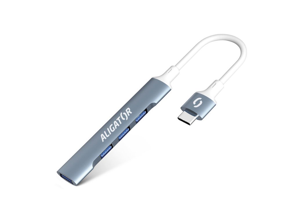 Pripojenie k počítaču pomocou USB-C, 4 x USB port, prenosová rýchlosť až 5 Gb/s, podpora USB 3.2 Gen 1, miniatúrne, dizajnové kovové telo Kompaktný a výkonný USB-C Hub Rozšírte vaše možnosti pripojenia Chýba vám ďalší USB port na Vašom ultrabooku? ALIGATOR USB-C Hub je tu pre Vás! Vďaka štyrom USB portom a podpore USB 3.2 s rýchlosťou až 5Gb/s ponúka maximálnu flexibilitu a pohodlie pri práci s rôznymi zariadeniami. Elegantné a Odolné Kovové Telo Štýl a kvalita v jednom ALIGATOR USB-C húb sa pýši elegantným kovovým telom, ktoré nielen skvele vyzerá, ale je tiež vysoko odolné. Jeho miniatúrne rozmery zaručujú ľahkú prenosnosť a úsporu miesta na pracovnom stole. Jednoduché Pripojenie USB-C Kompatibilita na prvom mieste Vďaka pripojeniu káblom s USB-C konektorom je ALIGATOR húb kompatibilný prakticky so všetkými súčasnými notebookmi, ultrabookmi, tabletmi, ale aj mobilnými telefónmi. Jednoduché a rýchle pripojenie vám umožní okamžite začať pracovať bez zbytočného zdržiavania. Parametre Pripojenie k počítaču: USB-C Dĺžka kábla: 100 mm Rozmery: Výška: 7 mm Šírka: 17mm Dĺžka: 107mm Konektory / pripojenie: 4x USB-A, z toho: 3x USB 2.0 1x USB 3.2 Gen 1 (5Gb/s) Prevedenie: Kovové puzdro (F) s podporou USB 3.2 Návod súčasťou obaluDodatočné parametre