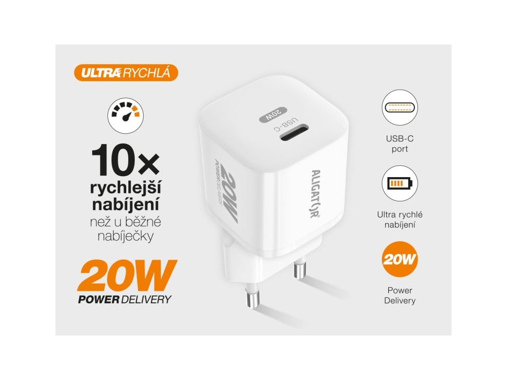 Rýchla sieťová 20W mini nabíjačka USB-C ALIGATOR Power Delivery s káblom USB-C/USB-C