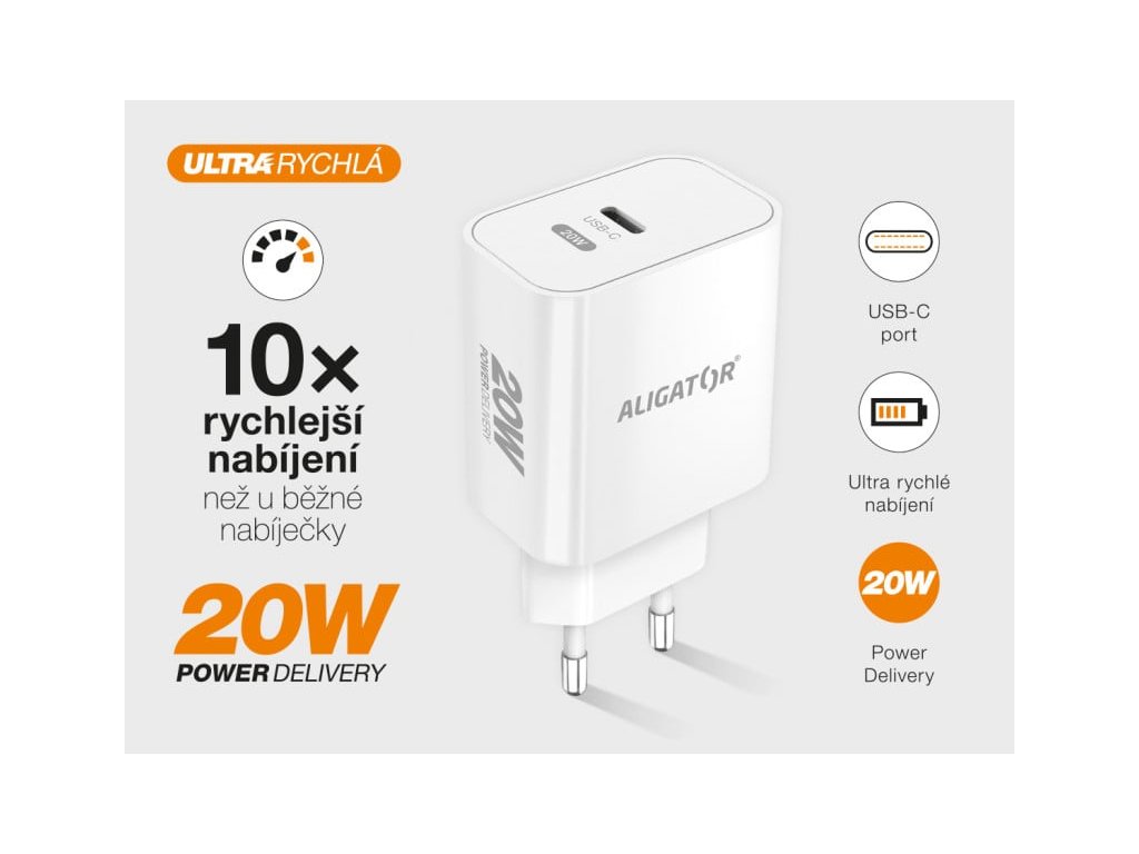 Výkonná sieťová nabíjačka radu "POWER DELIVERY" v modernom bielom dizajne s ultrarýchlym 20W portom USB-C.