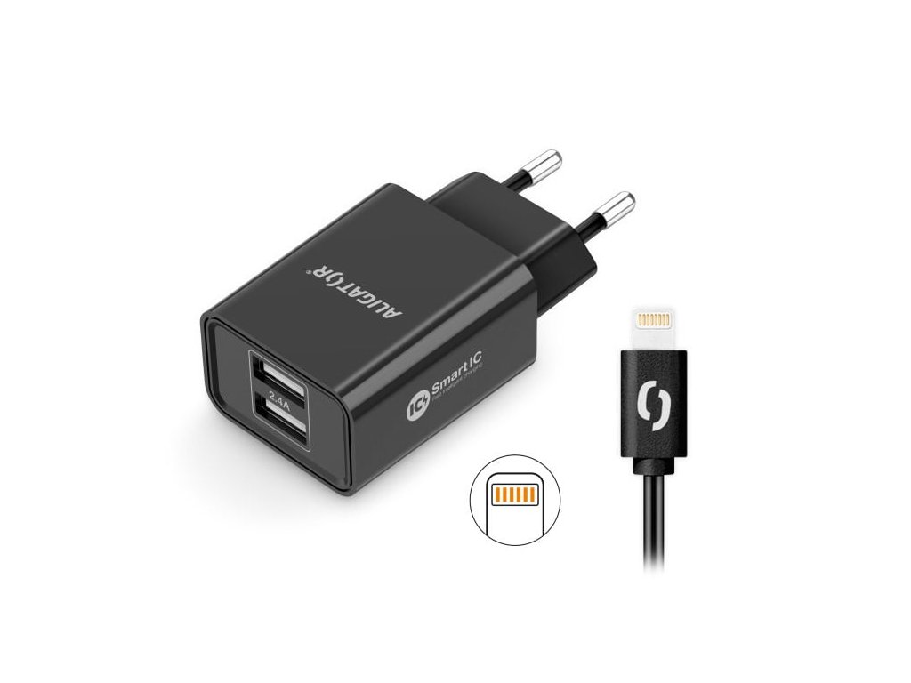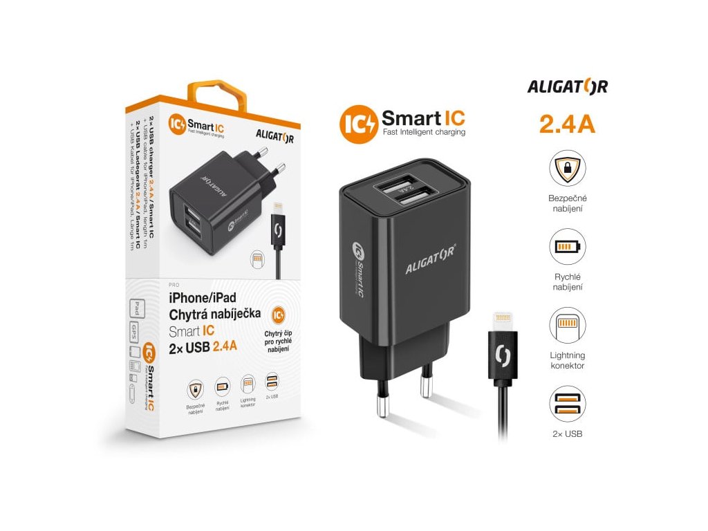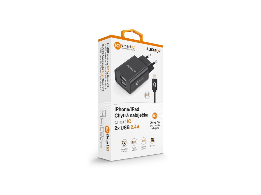 Múdra sieťová nabíjačka ALIGATOR 2,4 A, 2xUSB, inteligentný IC, čierna, kábel pre iPhone/iPad 2A