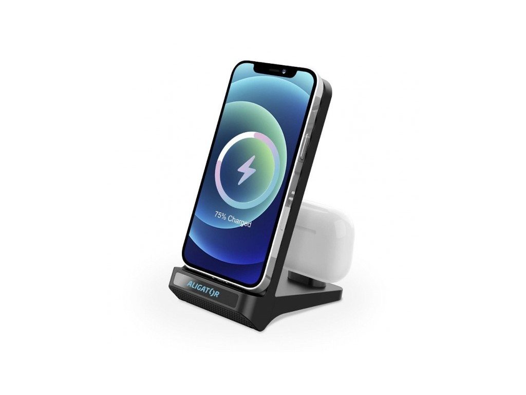 Inteligentné, bezdrôtové a 2v1 Stojan s 15W bezdrôtovým nabíjaním a konektorom USB-C, 2v1 Bezdrôtový nabíjací stojan Aligator, 2 v 1. 15W rýchle bezdrôtové nabíjanie smartfónu a konektor USB-C na nabíjanie sluchátkov True Wireles. Dvojvodičová konštrukcia Úplne bez starostí! Dvojčlánková konštrukcia stojana umožňuje nabíjať telefón v horizontálnej aj vertikálnej polohe. Môžete tak napríklad sledovať svoje obľúbené videá a zároveň nabíjať telefón. Výkonný a praktický Dve zariadenia naraz Vďaka zabudovanému konektoru USB-C môžete stojan používať aj ako nabíjačku pre sluchátka True Wireless alebo drobné príslušenstvo. Nabíjajte teda dve svoje zariadenia naraz! Rýchle nabíjanie bez kábla Nenechá ťa v tom! Stojan Aligator 2v1 zvládne rýchle bezdrôtové nabíjanie s úžasným výkonom 15 W! Užívajte si nabíjanie pohodlne a bez kábla! Čo je to bezdrôtové nabíjanie? Technológia Qi využíva na prenos elektrickej energie elektromagnetické pole s adaptívnym riadením výkonu. Vďaka tomu je nabíjanie mobilných telefónov bezpečné a jednoduché. Stojan umožňuje bezdrôtovo nabíjať moderné telefóny výkonom až 15 W, čo je 6-krát viac ako pri základnej nabíjačke USB! Kompatibilný so zariadeniami, ktoré podporujú bezdrôtové nabíjanie. Špecifikácia: USB-C port. Výstup Qi: 15 W (max.) Výstup USB-C: 9V/2,2A (max.) Dodávka napájania Technológia Qi Ochrana proti skratu a preťaženiu Kabel USB/USB-C súčasťou balenia Farba: čierna Obsah balenia: Stojan Nabíjací kábel USB/USB-C Príručka užívateľaDodatočné parametre