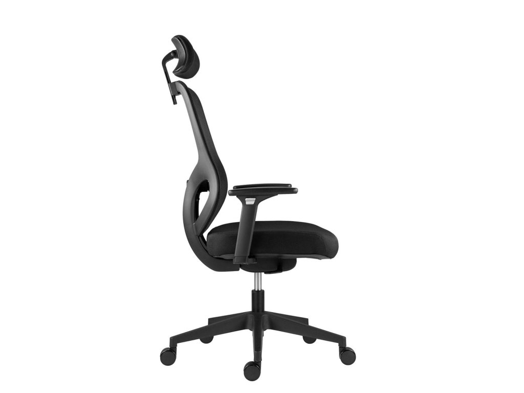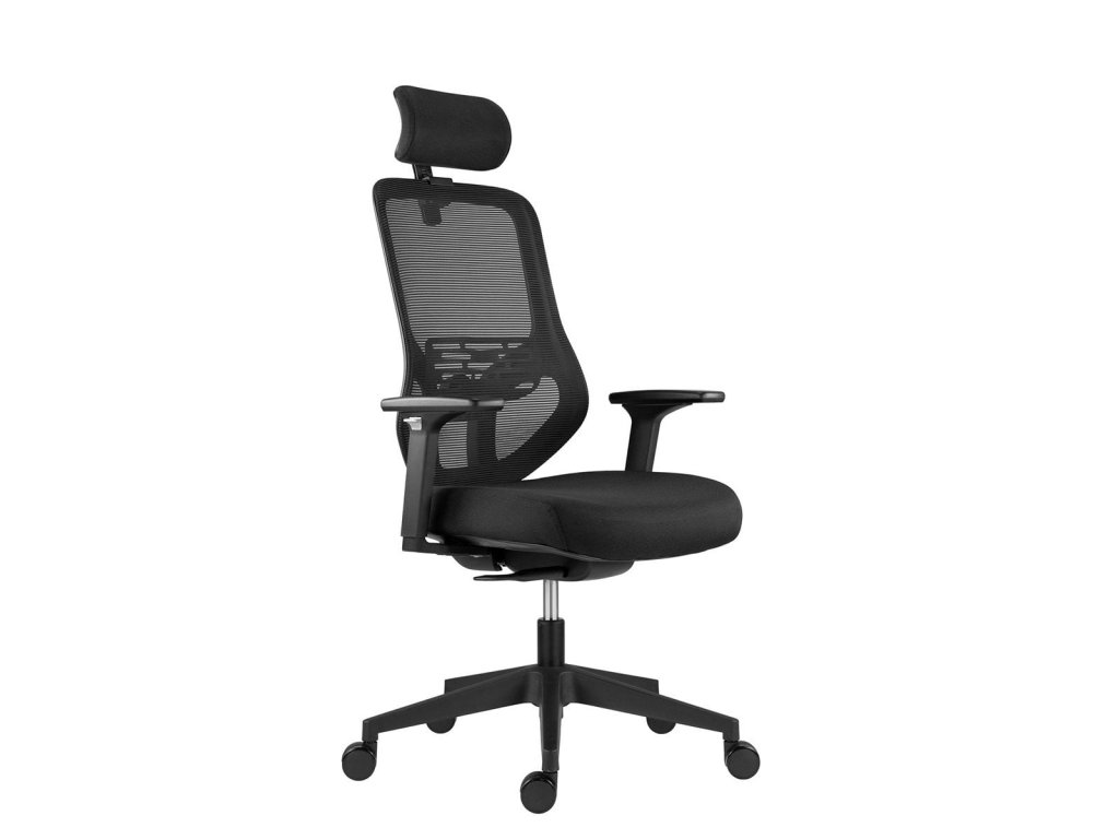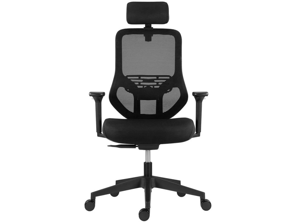 kancelárska stolička so sieťkou na sedadle, čalúneným operádlom a opierkou hlavy opierka 2D výškovo, uhľovo a podĺžne nastaviteľné podrúčky s mäkkým dotykovým povrchom O60 mm kolesá s gumovou obručou pre všetky typy podlah pohodlné sedadlo s výškou čalúnenie 90 mm farba sieťoviny a čalúnenie: čierna nosnosť: 130 kg záruka: 60 mesiacovDodatočné parametre