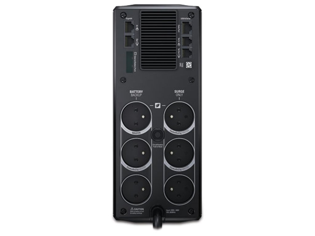 Záložný zdroj Power Saving Back-UPS RS 1500 od spoločnosti APC predstavuje zariadenie zaisťujúce zásobenie počítača aj v prípade neočakávaného výpadku prúdu a tiež ho ochráni pred prepätím. Záložné napájanie zaisťuje vo vnútri uložená užívateľom počas prevádzky vymeniteľné, olovené, bezúdržbové akumulátory, ktoré sú schopné poskytnúť výstupný výkon až 865 W, resp. 1500 VA. Typická doba zálohy činní pri 100% záťaži (865W) až 5,5 min a pri 50% záťaži (432W) až 16 min. Samozrejmosťou je komunikácia s počítačom za pomoci rozhrania USB alebo RS232. Pre kontrolu nad zdrojom je k dispozícii aj LCD stavový displej. K zariadeniu je možné pripojiť celý rad zariadení za pomoci celkom šiestich zásuviek French/Belgian vrátane funkcie prepäťovej ochrany. Tri z týchto zásuviek umožňujú batériové záložné napájanie v prípade výpadku prúdu a zvyšné tri sú iba chránené prepäťovou ochrannou (vhodné pre ochranu laserových tlačiarní, scannerov, či iných zariadení s veľkým odberom). Prepäťová ochrana je tiež dostupná pre telefónnu prípojku s konektorom RJ11 a sieťové rozhranie Ethernet s konektorom RJ45. Rozmery zariadenia sú 301 x 112 x 380 mm pri hmotnosti 12,7 kg. APC Back-UPS RS, 865 Watts / 1500 VA, Vstup 230V / Výstup 230V Účinnosť pri polovičnej záťaži 85% Externá batéria - BR24BPG Pripojenie výstupu 3 slovenskej zásuvky (Záložná prevádzka na batérie) 3 slovenské zásuvky (PreťDodatočné parametre