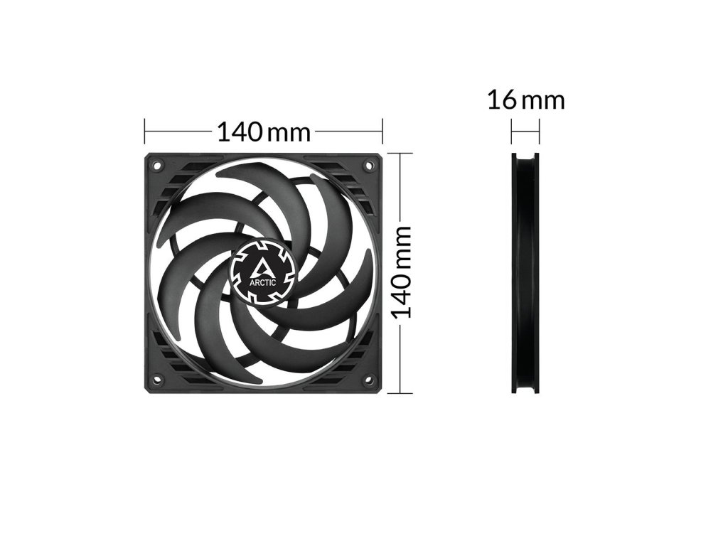 Mimoriadne účinný ventilátor zo série Arctic "P" - vysokotlakový. To znamená model optimalizovaný pre maximálny statický tlak, ideálny pre vežové chladiče, radiátory vodného chladenia, v skrini, kde je obmedzený priestor a prekážajú iné komponenty, a všade tam, kde vzduch musí prechádzať cez prekážky v podobe iných komponentov. Celý systém je tak chladený veľmi ticho a pritom v prípade potreby ponúka vynikajúci výkon. SLIM model s tloušťkou iba 16 mm. Špecifikácia: Rozmery: 140 x 140 x 16 mm Otáčky: 150 - 1 800 otáčok za minútu (riadené PWM PST) Prietok vzduchu: 88,35 CFM Úroveň hluku: 0,3 Sone Ložiská: Fluid Dynamic Konektor: 4-pinovýDodatočné parametre