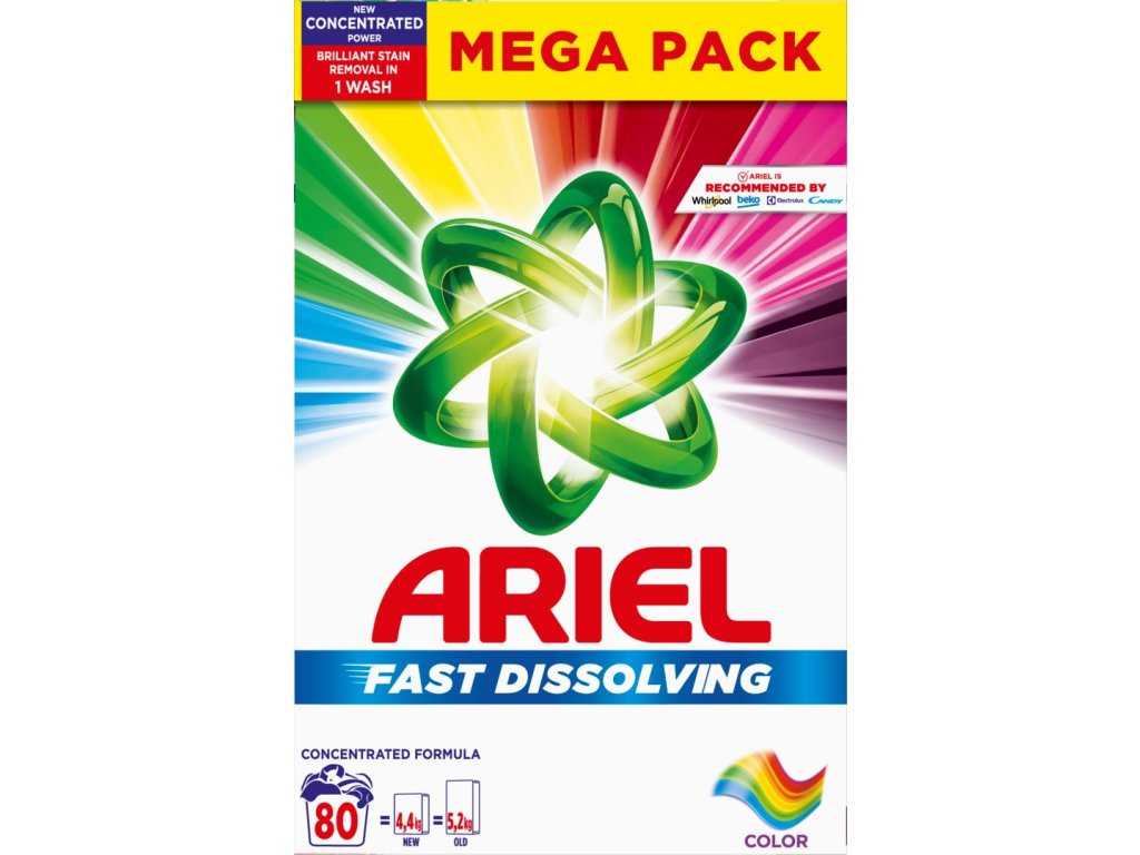 Ariel, značka odporúčaná spoločnosťami Whirlpool, Electrolux, Candy a Beko, predstavuje prací prášok Ariel Color Fast Dissolving. Prací prášok Ariel dodáva viac sviežosti a účinne odstraňuje skvrny aj pri krátkom praní na nízkej teplote. Vďaka jedinečnej technológii Fast Dissolving sa prášok pri kontakte s vodou rýchlo rozpúšťa, okamžite sa aktivuje a preniká hlboko do vlákien aj pri krátkych cykloch s nízkou teplotou. Znížte teplotu prania na 30 °C a ušetrite až 60 % energie (spotreba energie práčky pri znížení teploty prania zo 60 °C na 30 °C, normálny prací cyklus). A cykly prania za studena pomáhajú chrániť tkaniny dlhšie ako pranie v horúcej vode. Jeho zloženie obsahuje biologicky odbúrateľné zložky (80 % všetkých organických zložiek je biologicky odbúrateľných). Prací prostriedok Ariel Color sa navyše dodáva v 100% recyklovateľných obaloch.Dodatočné parametre