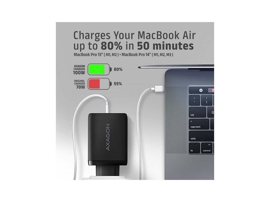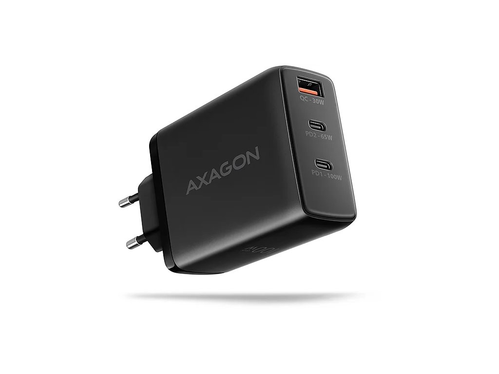 AXAGON ACU-DPQ100, sieťová nabíjačka GaN 100 W, 3x port (USB-A + dvojitý USB-C), PD3.0/PPS/QC4+/Apple