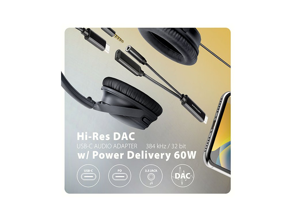 AXAGON ADA-HCPD, USB-C na 3,5 mm jack - Hi-Res DAC audio adaptér, 384 kHz/32bit, stereo, PD 60W 3A