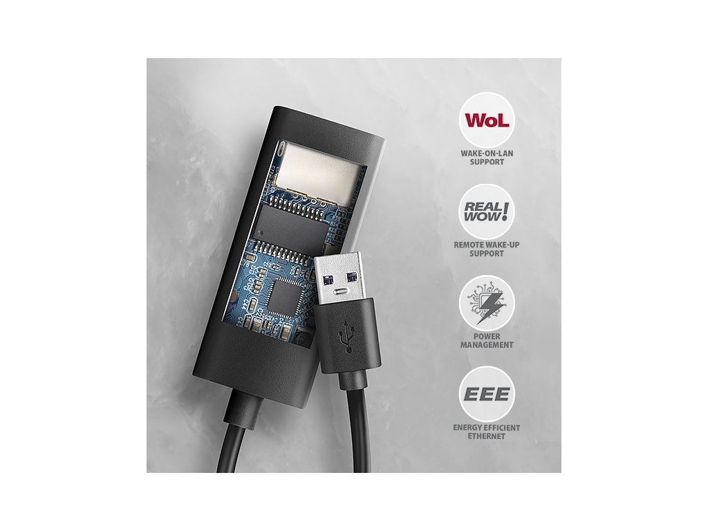 Externá sieťová karta AXAGON ADE-AR ľahko zmení port USB-A 3.2 Gen 1 na port Gigabit Ethernet. Síťový adaptér USB kompatibilný s 10/100/1000 Mbit/s rozšíri váš počítač o rýchle a stabilné sieťové pripojenie, doplní chybajúci sieťový konektor RJ-45, pridá ďalšiu sieťovú kartu alebo nahradí pôvodné nefunkčné sieťové pripojenie. Okrem gigabitovej priepustnosti ponúka sieťový adaptér LAN širokú škálu funkcií, ako je napríklad kontrolný súčet IPv4/IPv6 na zníženie zaťaženia procesora kontrolným súčtom, detekcia a automatická korekcia kríženia, odľahčenie veľkého odosielania TCP, podpora rôznych režimov funkcie Wake-on-LAN, prevádzka VLAN a pokročilé funkcie správy napájania. Vďaka kompaktným rozmerom a minimálnej hmotnosti je ideálnym doplnkom prenosných počítačov. Podpora aktuálnych verzií systémov Windows, macOS, Linux a Chrome OS umožňuje jeho použitie pre akýkoľvek stolný počítač, notebook alebo ultrabook. V systéme Windows 8.1 a vyššom umožňuje adaptér jednoduchú automatickú inštaláciu bez potreby pripojenia k internetu. Vstup: - USB 5Gb/s (USB 3.2 Gen 1 / USB 3.0). - Späť kompatibilný s USB 480 Mb/s (USB 2.0) a USB 1.1. - Pripojenie k počítaču prostredníctvom konektora USB typu A samec. Výstup: - Rozhranie Gigabit Ethernet s konektorom RJ-45 na pripojenie pomocou kábla UTP alebo STP. - Podporované prenosové rýchlosti rozhrania Ethernet 10/100/1000 Mb/s. - Podporované špecifikácie IEEE 802.3 10Base-T, IEEE 802.3u 100Base-TX, IEEE 802.3ab 1000Base-T. - Automatická detekcia 10/100/1000 Mb/s. - Podpora technológie IPv4/IPv6 Packet Checksum Offload Engine (COE) na zníženie zaťaženia procesora vrátane kontroly a generovania kontrolných súčtov IPv4 IP/TCP/UDP/ICMP/IGMP & IPv6 TCP/UDP/ICMPv6. - Podpora pre vyradenie veľkého odosielania TCP V1 a V2. - Podpora kódovania a dekódovania priorit 2. vrstvy IEEE 802.1P. - Podpora značkovania IEEE 802.1Q VLAN. - Podpora IEEE 802.3az EEE (Energy Efficient Ethernet) - zníženie spotreby energie v stave nečinnosti. - Podpora rámcov Jumbo. - Podpora plnoduplexných prenosov s riadením toku IEEE 802.3xa poloduplexných prenosov so spätným riadením toku. - Podpora Auto MDI/MDIX - detekcia kríženia a automatická korekcia eliminuje potrebu kríženia káblov. - Podpora hardvérovej kontroly cyklickej redundancie (CRC) na detekciu chyb pri prenose. - Podpora výmeny párov/korekcie polarity/skočenia. Ďalšie funkcie: - Plná podpora Plug and Play a Hot Plug. - Podpora CDC-ECM - na automatickú inštaláciu ovládačov v rôznych operačných systémoch. - Napájanie zo sběrnice USB - nie je potrebný žiadny ďalší zdroj napájania. - Dve LED diódy na indikáciu sieťovej aktivity a pripojenie adaptéra k sieti. - Rozmery 58 x 24 x 16 mm. - Hmotnosť 22 g (včítane kábla). - Dĺžka kábla USB 15 cm. - Použitá čipová súprava Realtek RTL8153. Podpora funkcie Wake-on-LAN v rôznych režimoch: - Podporuje režim spánku a diaľkové prebudenie prostredníctvom balíka Magic, Microsoft Wakeup Frame, Microsoft Wake Packet Detection a tiež prebudenia pri zmene spojenia. - Podpora štandardu ECMA-393 proxZzzy® for sleeping hosts na správu sieťových pripojení spiacich hostiteľov pomocou proxy serverov. - Podpora technológie RealWoW! umožňuje vzdialené prebúdzanie prostredníctvom internetu. Pokročilé funkcie správy napájania: Adaptér podporuje pokročilú správu napájania na zníženie straty energie počas nečinnosti alebo slabého sieťového prevádzky. Podporuje aj pokročilú úsporu energie pri odpojení ethernetového kábla. - Podpora rozhrania ACPI (Advanced Configuration Power Management Interface). - Podpora odľahčenia správy napájania (ARP a NS). - Podpora funkcie Microsoft Always On Always Connected (AOAC). - Podpora Intel Converged Platform Power Management (CPPM). - Podpora správy napájania prepojenia (LPM). - Podpora správy napájania riadenej operačným systémom (OSPM). - Podpora IEEE 802.3az EEE (Energy Efficient Ethernet). Podporované operačné systémy: - Windows, macOS, Linux a Chrome OS. Balenie v kartónovej krabici s otvorom na zavesenie obsahuje: - Adaptér USB - Gigabit Ethernet s 15 cm pevným káblom USB-A, - viacjazyčný manuál zavesenie.Dodatočné parametre
