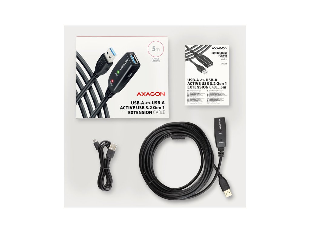 Aktívny predlžovací kábel AXAGON ADR-305 5 m USB 3.2 Gen 1 je ideálny na pripojenie počítača k zariadeniam USB, ako je myš, klávesnica, webová kamera, tlačiareň, skener, plotter a ďalšie. Aktívny opakovací kábel USB zosilňuje priepustnosť signálu a umožňuje pripojiť zariadenia USB na podstatne väčšiu vzdialenosť, než umožňuje pasívny kábel. Dosah kábla možno naďalej rozšíriť použitím niekoľkých káblov za sebou. Vďaka použitému rozhraniu USB 3.2 Gen 1 (predtým USB 3.0) môžete využívať prenos dať rýchlosťou až 5 Gb/s. Kabel teda môžete použiť aj pre zariadenia vyžadujúce vyššie rýchlosti, ako sú zálohovacie systémy, dátové úložiská NAS a ďalšie. Veľkou výhodou kábla ADR-305 je integrovaný konektor pomocného napájania. Vo väčšine prípadov postačí napájanie cez sběrnicu USB, ale v prípade zariadení s vyššou spotrebou energie môže byť napájanie cez USB na dlhšie vzdialenosti nedostatočné av týchto prípadoch môže problém vyriešiť prídavné sieťové napájanie. Výnimočne kompaktné telo opakovacieho kábla umožňuje bezproblémové použitie v elektroinstalačných lištách alebo káblových systémoch. Použitie vysokokvalitného tieneného kábla zabezpečuje vysokú rýchlosť komunikácie a minimálne nežiaduce rušenie. Vstup: - USB 3.2 Gen 1 na pripojenie k počítaču - Konektor USB typu A (M) samec Výstup: - USB 3.2 Gen 1 na pripojenie diaľkového zariadenia USB - Konektor USB typu A (F) samica - Prenosová rýchlosť 5000 / 480 / 12 / 1,5 Mbit/s (super / vysoká / plná pripojených zariadení cez sběrnicu USB (režim napájania zo sběrnice 5 V - 500 mA). - Pre väčšinu pripojených zariadení USB je napájanie cez sběrnicu USB dostatočné a nie je potrebné žiadne ďalšie napájanie. - Atívna časť kábla obsahuje konektor Micro USB na dodatočné externé napájanie 5V/1-2A. - Súčasťou dodávky je napájací kábel USB AM/Micro USB s dĺžkou 1,2 m. Kabel umožňuje napájanie zo štandardnej nabíjačky mobilného telefónu s výstupom USB-A 5 V/min. 1 A, napr. z nabíjačky AXAGON ACU-DS16. - Pri napájaní opakovacieho kábla pomocou napájacieho adaptéra možno pripojiť aj externý 2,5" disk bez potreby napájania samotného disku. - Pri dlhších trasách USB s viacerými opakovacími káblami zapojenými do série môže byť napájanie po sběrnici USB už nedostatočné aj pre zariadenia USB s nižšou spotrebou energie ako externý 2,5" disk. Aj v tomto prípade môže pomôcť zvýšenie napájania pripojením napájacieho adaptéra. Ďalšie funkcie: - Plne kompatibilný s USB 3.2 Gen1 (USB 3.0) a spätne kompatibilný s USB 2.0 a USB 1.1. - Plná podpora Plug and Play a Hot Plug. - Dve LED diódy indikujúce napájanie a pripojenie zariadenia USB. - Za aktívnym káblom USB možno použiť bežný pasívny kábel USB. - Rozmery aktívnej časti sú 75 x 24 x 13 mm, dĺžka kábla 5 m. - Hmotnosť 208 g. Podporované operačné systémy: - MS Windows XP/Vista/7/8/8.1/10/11 a novější novšie (podporované všetky 32- a 64-bitové verzie OS Windows), Mac OS X 10.xa novšie, Linux s jadrom 2.6.xa novějším. - Poznámka: Ovládače sú súčasťou podporovaných operačných systémov a nainštalujú sa automaticky. Žiadne iné ovládače nie je potrebné inštalovať ani nie sú k dispozícii. Balenie v krabici obsahuje: - USB 3.0 AM > AF aktívny kábel dlhý 5 m, - napájací kábel USB-A / Micro USB, - viacjazyčný manuál SK/DE/DK/ENG/ESP/FIN/FR/GR/HR/HU/IT/NL/PL/PT/RO/RU/SK/SWE/BG/CN/TR/ARA.Dodatočné parametre