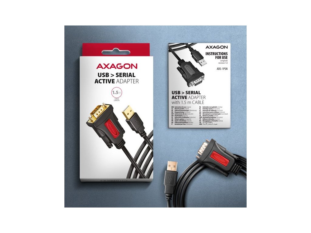 Aktívny prevodník USB AXAGON ADS-1PSN ľahko rozšíri váš počítač o sériový port RS 232. Bezproblémová kompatibilita adaptéra USB – sériový RS232 je spôsobená použitím originálneho čipu od taiwanskej spoločnosti Prolific. Pevný 1,5 m dlhý kábel USB-A je vhodný na použitie so stolnými aj prenosnými počítačmi. Kabel je vybavený pozlátenými konektormi a kontaktmi, vysoko odolné telo adaptéra je vhodné aj pre priemyselné aplikácie. Dvojité tienenie chráni prenášané signály pred nepříznivým rušením. Prevodník je ideálnym počítačovým príslušenstvom na pripojenie snímačov čárových kódov, POS tlačiarní, skenerov, programátorov mikrokontrolérov, CNC strojov, modemov, aktualizáciu alebo konfiguráciu set-top boxov, bezpečnostných zariadení, prepínačov, rádií a ďalších zariadení. Vstup: - Rozhranie USB 480 Mb/s (USB 2.0), spätne kompatibilné s USB 1.1. - Konektor USB typu A samec umiestnený na pevnom 1,5 m kábli. Výstup: - 1x sériový port RS-232 so samčím konektorom DB9 integrovaným v tele adaptéra. - Prenosová rýchlosť nastaviteľná v rozsahu 75 bit/s - 1000 kbit/s. - Kompatibilný s 16C950 UART, spätne kompatibilný s 16C550, 16C650, 16C750 a 16C850. Ďalšie funkcie: - Podpora Plug and Play. - Vyrovnávacia pamäť FIFO na odosielanie 768B a prijímanie 256B. - Konfigurovateľné riadenie toku Xon/Xoff, hardvérové alebo žiadne. - Nastaviteľná dĺžka slova 4, 5, 6, 7 alebo 8 bitov. - Nastaviteľná parita (páreň, lienka, žiadna, značka, medzera), 1, 1,5 alebo 2 stôp bity. - Nastaviteľné využitie vyrovnávacej pamäte FIFO: príjem (1 - 14b) a vysílání (1 - 16b). - Nastaviteľné číslo portu COM1 až COM256. - Podpora správy napájania. - Napájanie adaptéra cez sběrnicu USB (napájanie zo sběrnice) - nie je potrebný žiadny ďalší zdroj napájania. - Pozlátené konektory a kontakty zaisťujú spolehlivé pripojenie a zabraňujú oxidácii, čím zabezpečujú dlhú životnosť prevodníka. - Vonkajší priemer kábla 5 mm, dvojité tienenie. - Použitá originálna čipová súprava Prolific PL2303GT s integrovaným budičom sériových liniek. - Rozmery tela adaptéra 35 x 56 x 17 mm, dĺžka kábla 1,5 m. - Hmotnosť adaptéra 83 g (včítane kábla). Podporované operačné systémy: - MS Windows XP / Vista / 7 / 8 / 8.1 / 10 / 11 a novšie, Windows Server 2003 / 2008 / 2012 / 2016 / 2019 / 2022 a novšie (podporované všetky 32- a 64-bitové verzie. Linux s jadrom 2.6.xa novějším, Android väčšina verzií. - Poznámka: Ovládače sú súčasťou podporovaných operačných systémov a nainštalujú sa automaticky. Balené v kartónovej krabici s otvorom na zavesenie a obsahuje: - USB - sériový adaptér s 1,5 m pevným káblom USB - viacjazyčný manuál SK/DE/DK/ENG/ESP/FIN/FR/GR/HR/HU/IT/NL/PL/PT/RO/RU/SK/SWE/BG/CN/TR/ARA.Dodatočné parametre