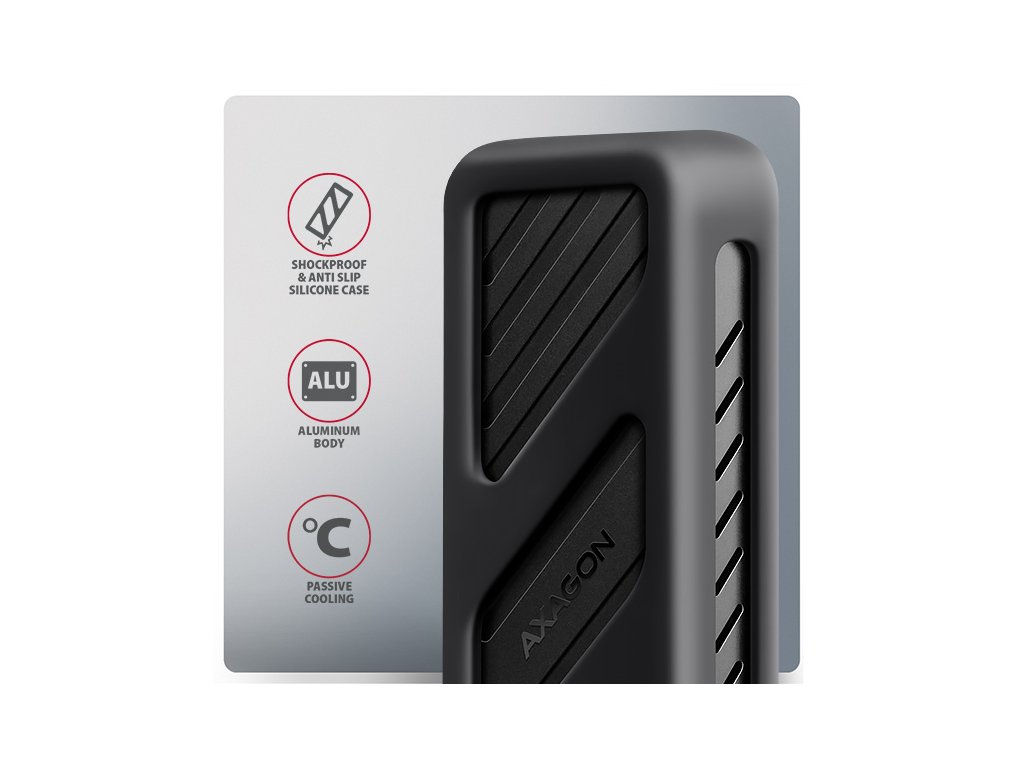 Rýchly externý box AXAGON EEM2-20G ARMORED s rozhraním USB 20 Gb/s pre disky M.2 NVMe SSD. Spoľahlivé pripojenie umožňuje obojstranný konektor USB-C na boxe. V balení nájdete kábel USB-C -> USB-C na pripojenie boxu k počítaču. Vďaka rozhraniu USB 20 Gb/s je prenosová rýchlosť až 20 Gb/s. Ak chcete naplno využiť rýchlosť boxu, radič pripojeného zariadenia musí byť kompatibilný s rozhraním USB 3.2 Gen 2x2. Tieto radiče sa obvykle používajú v herných notebookoch a moderných stolových počítačoch. Externý box M.2 podporuje aj ďalšie moderné funkcie, ako sú UASP, TRIM a umožňuje čítať informácie SMART na monitorovanie stavu disku. Podpora režimu úspory energie pri nečinnosti. Výhodou boxu je príama montáž pre štyri rôzne dĺžka SSD - 30, 42, 60 a 80 mm. Disky M.2 môžu byť jednostranné alebo oboustranné. Box nemá žiadne obmedzenie kapacity vloženého SSD. Otváranie boxu pomocou jediného skrutky uľahčuje montáž a demontáž disku M.2 SSD. Výmena diskov je rýchla a jednoduchá, čo rozširuje využitie boxu na migráciu dát, testovanie atď. Hliníkové telo boxu a teplovodivá podložka zabezpečujú veľmi dobré chladenie vloženého disku M.2 SSD. Ventilačné otvory po stranách zabezpečujú dostatočnú cirkuláciu vzduchu. To predĺžuje životnosť disku a taktiež zabraňuje spomaleniu rýchlosti disku nazývanému "Thermal Throttling". Ďalšou výhodou je silikónové puzdro, ktoré poskytuje lepšiu ochranu boxu pred nárazmi, zabraňuje kĺzaniu po stole a zabezpečuje pohodlné uchopenie do ruky. Vonkajší kovový plášť je vyhotovený v čiernej barve s elegantnou povrchovou úpravou, ktorá zabraňuje nechceným otlačkom prstov. Vložte do tohto boxu disk SSD M.2 a ľahko vytvorte rýchly a všestranný externý disk. Box možno používať s počítačmi a notebookmi, ako aj s mobilnými telefónmi a tabletmi. Vstup: - USB 20 Gb/s (USB 3.2 Gen 2x2), konektor USB-C samica. - Kompatibilný s USB 5 Gb/s, USB 10 Gb/s. Podpora zariadení: - SSD NVMe M.2, - Určené pre karty formátu M key alebo B+M key, - NGFF 75-pinový slot M key pre disky M.2. Maximálne teoretické podporované rýchlosti a kompatibilita s radičmi (portami) USB: - Notebook/PC s portom USB 20 Gbit/s (USB 3.2 Gen 2x2): max. rýchlosť 20 Gbit/s. - Notebook/PC s portom USB 10 Gb/s (USB 3.2 Gen 2): max. rýchlosť 10 Gbit/s. - Notebook/PC s portom USB 5 Gb/s (USB 3.2 Gen 1 / USB 3.0): max. rýchlosť 5 Gbit/s. - Kompatibilita s portami USB4, Thunderbolt 3/4: max. rýchlosť 10 Gbit/s. - Skutočná priepustnosť/prenosová rýchlosť boxu okolo 2000 MB/s (2 GB/s) je spôsobená limitmi rozhrania USB 3.2 Gen 2x2. Ďalšie funkcie: - Rozhranie USB 3.0, ktoré je vybavené rozhraním USB 3.0, je vybavené rozhraním USB 3.0: - Podpora prenosových rýchlostí 20 000 / 10 000 / 5 000 Mbit/s. - Podpora kľúčov M alebo B+M NVMe (PCI-Express) M.2 SSD bez obmedzenia maximálnej kapacity. - Podpora veľkosti diskov M.2 - 2230, 2242, 2260, 2280 mm. - Podpora jednostranných a obojstranných diskov SSD M.2. - V súlade so špecifikáciou PCI Express Base Specification Revision 3.1a. - V súlade so špecifikáciou NVM Express 1.3c. - Vyhovuje špecifikácii USB Mass Storage Class. - Podpora prepravy ľan hromadného materiálu (BOT). - Podpora USB Attached SCSI (UASP) na rýchlejší prenos dať v systéme Windows 8 a novšom. - Podpora funkcie TRIM na obmedzenie postupného znižovania výkonu SSD v priebehu času. - Podpora systému SMART (Self-Monitoring, Analysis, and Reporting Technology) na monitorovanie stavu disku. - Podpora spúšťania z disku SSD v externom boxe. - Podpora Hot Plug na pripojenie zariadení za chodu. - Úplná podpora Plug and Play. - Napájanie sběrnice USB až do 900 mA z jedného portu USB je vo všetkých prípadoch dostatočné. - Decentná modrá LED indikujúca pripojenie k portu USB počítača (stály svit) a prenos dát (blikanie). - Hliníkové odolné telo a teplovodivá podložka pomáhajú lepšie chladiť disk M.2 SSD. - Vyššia povrchová teplota boxu nie je na závadu - vďaka hliníkovému telu sa teplo vznikajúce pri prevádzke disku lepšie odvádza a prenáša do okolia. - Pripojenie prostredníctvom konektora USB 3.2 Gen 2x2 typu C samica. - Súčasťou balenia je kábel USB typu C samec / USB typu C samec dlhý 38 cm. Ďalšie informácie: V balení sa nachádza aj USB kábel s konektorom C, ktorý je určený na pripojenie k počítaču: - Rozmery krabice 15 x 112 x 40 mm (vx š xh). - Hmotnosť krabice 83 g (bez kábla, bez disku, bez puzdra). Podporované operačné systémy: - Windows 7/8.1/10/11 a novšie, macOS, iPadOS, iOS, Linux, Chrome OS a Android. - Kompatibilita závisí od aktualizovaného operačného systému a podpory zo strany výrobcu zariadenia. - Poznámka: Pri použití so systémom Windows 7 si overte podporu tohto operačného systému a dostupnosť ovládačov u výrobcu disku M.2 SSD. Balenie v kartónovej krabici s otvorom na zavesenie obsahuje: - USB-C 20Gb/s externý box pre M.2 SSD, - silikónové puzdro, - kábel USB-C na USB-C s dĺžkou 38 cm, - 1 ks teplovodivej podložky, - 1 ks montážneho materiálu a skrutkovač, - viacjazyčný SK/DE/DK/ENG/ESP/FIN/FR/GR/HR/HU/IT/NL/PL/PT/RO/SK/SWE/TR/UA/BG/CN/ARA.Dodatočné parametre