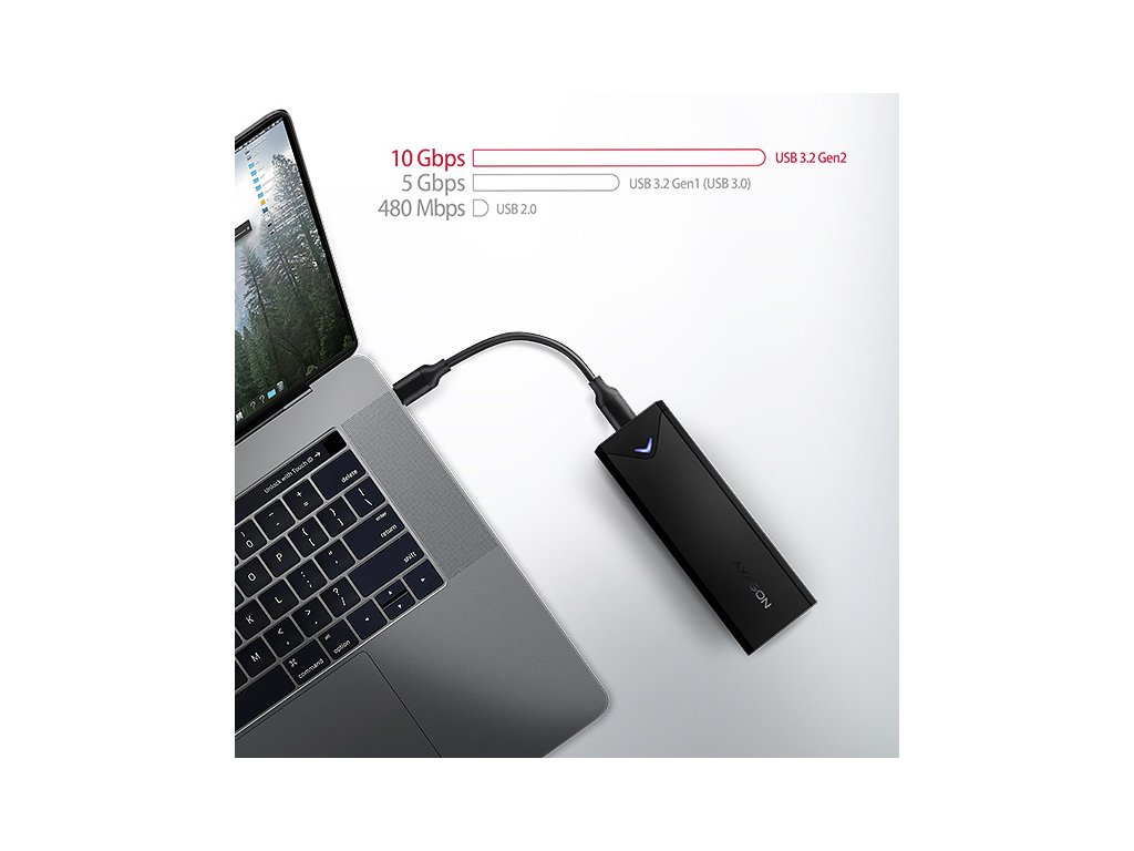 Rýchly externý box AXAGON EEM2-UB2 ARROW s rozhraním USB 10 Gb/s pre disky M.2 NVMe SSD. Spoľahlivé pripojenie umožňuje obojstranný konektor USB-C na boxe. V balení nájdete kábel USB-C -> USB-C na pripojenie boxu k počítaču. Vďaka rozhraniu USB 3.2 Gen 2 je prenosová rýchlosť až 10 Gb/s. Externý box M.2 podporuje aj ďalšie moderné funkcie, ako sú UASP, TRIM a umožňuje čítať informácie SMART na monitorovanie stavu disku. Podpora režimu úspory energie pri nečinnosti. Výhodou je montáž pre tri rôzne dĺžka SSD - 42, 60 a 80 mm. Disky M.2 môžu byť jednostranné alebo oboustranné. Skrinka nemá žiadne obmedzenie kapacity vloženého disku SSD. Otváranie boxu ľan pomocou jedného skrutky uľahčuje montáž a demontáž disku M.2 SSD. Výmena diskov je rýchla a jednoduchá, čo rozširuje možnosti použitia boxu napr. na migráciu dať, testovanie atď. Vonkajší kovový kryt je vyhotovený v čiernej barve s elegantným povrchom, ktorý zabraňuje nechceným otlačkom prstov. Hliníkové telo boxu a teplovodivá podložka zabezpečujú veľmi dobré chladenie vloženého disku M.2 SSD. To predĺžuje životnosť disku a taktiež zabraňuje spomaleniu rýchlosti disku nazývanému "Thermal Throttling". Vložením disku M.2 SSD do tohto boxu môžete ľahko vytvoriť rýchly, kompaktný a univerzálny externý disk. Box možno používať s počítačmi a notebookmi, ako aj s mobilnými telefónmi a tabletmi. Vstup: - USB 10 Gb/s (USB 3.2 Gen 2), konektor USB-C samice. - Kompatibilný s USB 3.2 Gen 1, USB4 a Thunderbolt 3/4. Podpora zariadení: - SSD NVMe M.2, - Určené pre karty formátu M key alebo B+M key, - NGFF 75-pinový slot M key pre disky M.2. Ďalšie funkcie: - Podporuje prenosové rýchlosti 10 000 / 5 000 / 480 Mbit/s. - Podpora pre disky M key alebo B+M key NVMe (PCI-Express) M.2 SSD bez obmedzenia maximálnej kapacity. - Podpora veľkosti diskov M.2 - 2242, 2260, 2280 mm. - Podpora jednostranných a obojstranných diskov M.2 SSD. - V súlade so špecifikáciou PCI Express Base Specification Revision 3.1a. - V súlade so špecifikáciou NVM Express 1.3. - Vyhovuje špecifikácii USB Mass Storage Class. - Celková priepustnosť/prenosová rýchlosť adaptéra závisí od použitého rozhrania USB (teoreticky až 10 Gbit/s). - Skutočná priepustnosť/prenosová rýchlosť adaptéra približne 1000 MB/s (1 GB/s) je určená limitmi rozhrania USB 3.2 Gen 2. - Podpora BOT (Bulk-Only Transport). - Podpora UASP (USB Attached SCSI) na rýchlejší prenos dať v systéme Windows 8 a novšom. - Podpora TRIM na obmedzenie postupného znižovania výkonu SSD v priebehu času. - Podpora systému SMART (Self-Monitoring, Analysis, and Reporting Technology) na monitorovanie stavu disku. - Podpora spúšťania z disku SSD v externom boxe. - Podpora Hot Plug na pripojenie zariadení za chodu. - Úplná podpora Plug and Play. - Podpora režimu úspory energie - uspanie disku po 5 minútach nečinnosti. - Napájanie cez sběrnicu USB do 900 mA z jedného portu USB je úplne postačujúce vo všetkých prípadoch. - Decentná modrá LED indikujúca pripojenie k portu USB počítača (stály svit) a prenos dát (blikanie). - Hliníkové odolné telo a teplovodivá podložka pomáhajú lepšie chladiť disk M.2 SSD. - Vyššia povrchová teplota boxu nie je na závadu - vďaka hliníkovému telu sa teplo vznikajúce pri prevádzke disku lepšie odvádza a prenáša do okolia. - Pripojenie prostredníctvom konektora USB 3.2 Gen 2 typu C samica. - Súčasťou balenia je kábel USB typu C samec / USB typu C samec dlhý 20 cm. Ďalšie informácie: V balení sa nachádza aj kábel C USB 3. Kabel je vybavený konektorom USB 3: - Rozmery krabice 115 x 39 x 11 mm. - Hmotnosť krabice 43 g (bez kábla a jednotky M.2). Podporované operačné systémy: - Windows 7/8.1/10/11 a novšie, macOS, iPadOS, iOS, Linux, Chrome OS a Android. - Kompatibilita závisí od aktualizovaného operačného systému a podpory zo strany výrobcu zariadenia. - Poznámka: Pri použití so systémom Windows 7 si overte podporu tohto operačného systému a dostupnosť ovládačov u výrobcu disku M.2 SSD. Balenie v kartónovej krabici s otvorom na zavesenie obsahuje: - USB-C 10Gb/s externý box pre M.2 SSD, - kábel USB-C na USB-C s dĺžkou 20 cm, - 3 ks teplovodivých podložiek, - montážny materiál a skrutkovač, - viacjazyčný návod SK/DE/DK/ENG/ESP/FIN/FR/GR/HR/HU/IT/NL/PL/PT/RO/SK/SWE/TR/UA/BG/CN/ARA.Dodatočné parametre