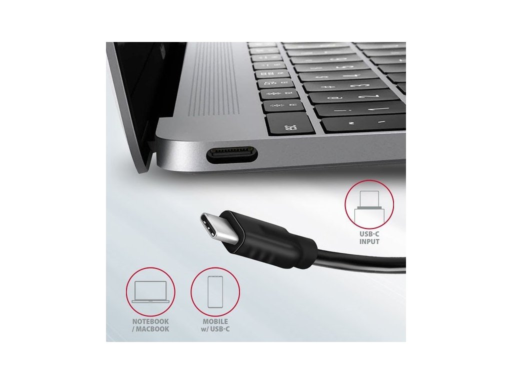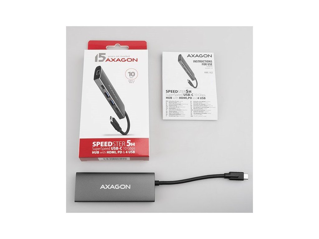 Viacportový rozbočovač AXAGON HMC-5G2 SPEEDSTER 5v1 USB-C 10Gb/s rozšíri váš notebook, počítač alebo telefón o päť portov. Ľahko a rýchlo pripojíte monitor a tri zariadenia USB súčasne k počítaču prostredníctvom oboustranného konektora USB-C. Zároveň získate možnosť napájať svoj notebook pomocou technológie Power Delivery. Replikátor portov vám poskytuje jednoduchú a kompaktnú dokovaciu stanicu 5 v 1 nielen pre notebooky so systémom Windows, ale aj pre notebooky Apple, ako sú MacBook Air alebo MacBook Pro. Rozbočovač USB ponúka celkom štyri 10Gb/s výstupy USB - dva so štandardnými konektormi USB-A a dva s konektorom USB-C. Vďaka pokročilému štandardu USB 3.2 Gen 2 môžete k všetkým výstupom pripojiť vysokorýchlostné zariadenia, ako sú externé disky NVMe M.2, a to až dvojnásobnou rýchlosťou 10 Gb/s v porovnaní so štandardnými rozbočovačmi Gen 1 s rýchlosťou iba 5 Gb/s. Multiportový rozbočovač zvládne trvalé pripojenie viacerých externých diskov súčasne a umožňuje aj nabíjanie notebookov, telefónov a tabletov prúdom až 3A. Vďaka tomu môžete z rozbočovača ľahko nabíjať smartfón so systémom Android, Apple iPhone, Apple iPad atď. Jeden z portov USB-C je kombinovaný a možno ho použiť buď na prenos dát, alebo na nabíjanie telefónov a notebookov pomocou technológie Power Delivery 3.0 s výkonom až 100 W. Do rozbočovača zapojte vhodnú nabíjačku USB Power Delivery. Tím sa uvolní aj jeden port USB-C. Výstup HDMI poskytuje vysokokvalitné video s rozlišením až 4K/60 Hz Ultra HD a podporuje viackanálové streamovanie zvuku. Podporované sú aj vysoké frekvencie pri obľúbených herných rozlišeních 2K/120 Hz alebo FullHD/120 Hz. Vďaka podpore HDR (High Dynamic Range) si môžete vychutnať výrazne rozšírený rozsah farieb a kontrastov bez obmedzenia. Na správne fungovanie obrazového výstupu musí mať notebook port USB-C s podporou alternatívneho režimu DisplayPort (DP Alt Mode) alebo port Thunderbolt 3, 4 alebo vyšší. Kompaktné a tenké hliníkové telo nielenže skvele vyzerá, ale poskytuje aj mechanickú odolnosť a pasívne chladenie. Poteší aj jemne strukturovaný povrch odolný voči odtlačkom prstov. Rozbočovač USB-C je ideálnym príslušenstvom pre notebooky bez konektorov USB-A a video výstupu. Vaše existujúce periférne zariadenia USB môžete používať bez potreby nových. Vďaka funkciám Plug and Play a Hot Plug je samotné zapojenie rozbočovača veľmi jednoduché bez zložitej inštalácie a periférne zariadenia môžete ľahko pripájať a odpájať aj počas chodu počítača. Rozbočovač sa nevyhýba ani pripojeniu telefónov s konektorom USB-C. K telefónu tak môžete pripojiť flash disk, klávesnicu, myš, monitor, televízor alebo projektor. Vstup (pripojenie k notebooku): - USB 10 Gb/s (USB 3.2 Gen 2), konektor USB-C samec. - Kompatibilný s USB 3.2 Gen 1, USB4 a Thunderbolt 3/4. Vstup (napájanie): - USB Power Delivery 3.0 - 100W port, konektor USB-C samica. - Napájanie notebooku zo sieťového adaptéra cez rozbočovač USB-C. - Napájanie PD musí podporovať notebook (telefón) aj sieťová nabíjačka. Výstupy USB: - 2x port USB 10 Gb/s, konektor USB-A samice. - 1x port USB 10Gbps, konektor USB-C samice. - 1x port USB 10Gb/s na prenos dát alebo nabíjania Power Delivery, konektor USB-C samica. - Rozbočovač USB-C dokáže súčasne spracovať viaceré externé disky. - Rýchle nabíjanie mobilných zariadení prúdom až do 3A v portoch USB-C rozbočovača. Výstup HDMI: - 1x port HDMI, konektor HDMI A samica. - Rozlíšenie 4K 4096 x 2160 pri frekvencii až 60 Hz. - Rozlíšenie 2K/WQHD 2560 x 1440 pri frekvencii až 120 Hz. - Rozlíšenie FHD 1920 x 1080 pri frekvencii až 120 Hz. - Podpora vyššie uvedených maximálnych rozlišení a frekvencií vyžaduje pripojenie k počítaču s rozhraním DisplayPort verzie 1.4. - Pre funkčnosť video výstupu musí byť rozbočovač pripojený k portu USB-C s podporou alternatívneho režimu DisplayPort (DP Alt Mode) alebo k portu USB-C s podporou Thunderbolt 3/4. Vyžaduje sa aj vhodný operačný systém. Bez tejto podpory nebude funkcia video výstupu k dispozícii. - Podpora HDR (vysoký dynamický rozsah, 10-bitová podpora) - realistická reprodukcia svetlých a tmavých detailov. - Podpora HPD (Hot-Plug-Detect). - Podpora TMDS (Transition Minimized Differential Signaling - prechodovo minimalizovaná diferenciálna signalizácia). - Plná podpora HDCP 1.4 (High-bandwidth Digital Content Protection). - Podpora až 2-kanálového zvuku LPCM. - Podpora vzorkovacej frekvencie do 48 kHz a až 24-bitového zvuku - závisí od zdrojového a cieľového zariadenia, tj prenosného počítača/telefónu a televízora/monitora/AV prijímača. Ďalšie funkcie: - Pripojenie Hot Plug pre zariadenia za chodu. - Úplná podpora Plug and Play. - Plná podpora úsporného režimu. - Napájanie prostredníctvom napájania zo sběrnice USB alebo nabíjačky PD. - Odolné hliníkové telo pre lepšie chladenie rozbočovača. - Modrá LED dióda indikuje pripojenie rozbočovača k počítaču stálym svitom alebo pripojenie k nabíjačke Power Delivery jasnejším svitom. - Vysokokvalitný tienený kábel zabezpečuje vysokú rýchlosť komunikácie a minimálne nežiaduce rušenie. - Rozmery 105 x 40 x 12 mm. - Hmotnosť 60 g (včítane kábla). - Dĺžka kábla USB 13 cm. Podporované operačné systémy: - Microsoft Windows 10/11, MacOS, iPadOS, iOS, Linux, Chrome OS a Android. Kompatibilita závisí od použitého operačného systému a podpory výrobcu zariadenia. - Alternatívny režim DisplayPort (DP Alt Mode) je podporovaný len v aktualizovaných operačných systémoch a závisí aj od podpory zo strany zariadenia (notebook, telefón). - Ovládače grafickej karty môžu tiež ovplyvniť správny prevádzku produktu. Odporúčame stiahnuť najnovšiu verziu ovládačov. Poznámky: V