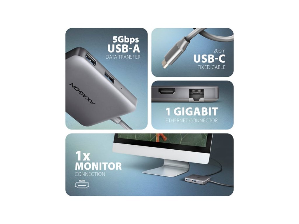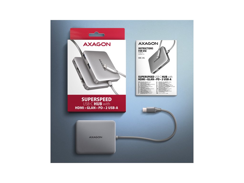 AXAGON HMC-5HL USB 5Gbps hub, 2x USB-A, HDMI 4k/60Hz, RJ-45 GLAN, PD 100W, USB-C kábel 20cm