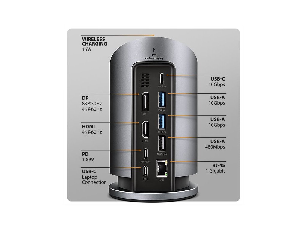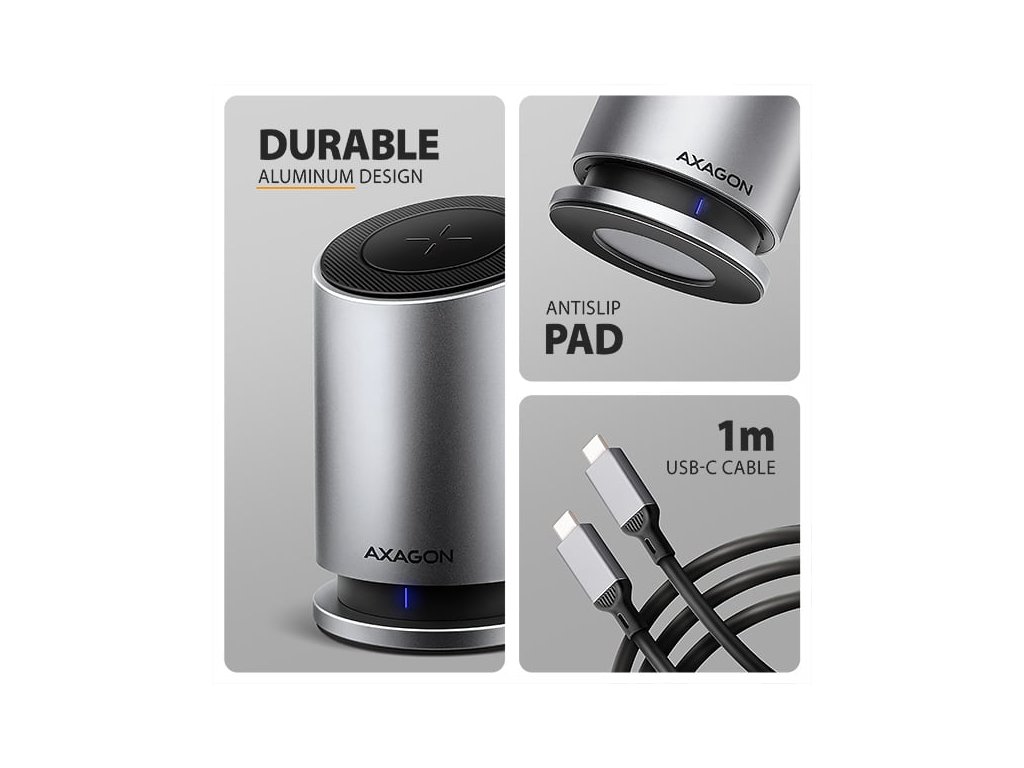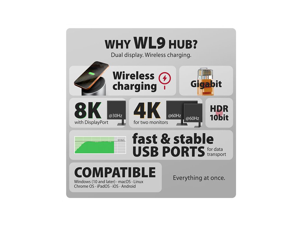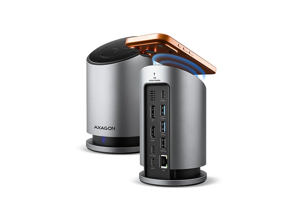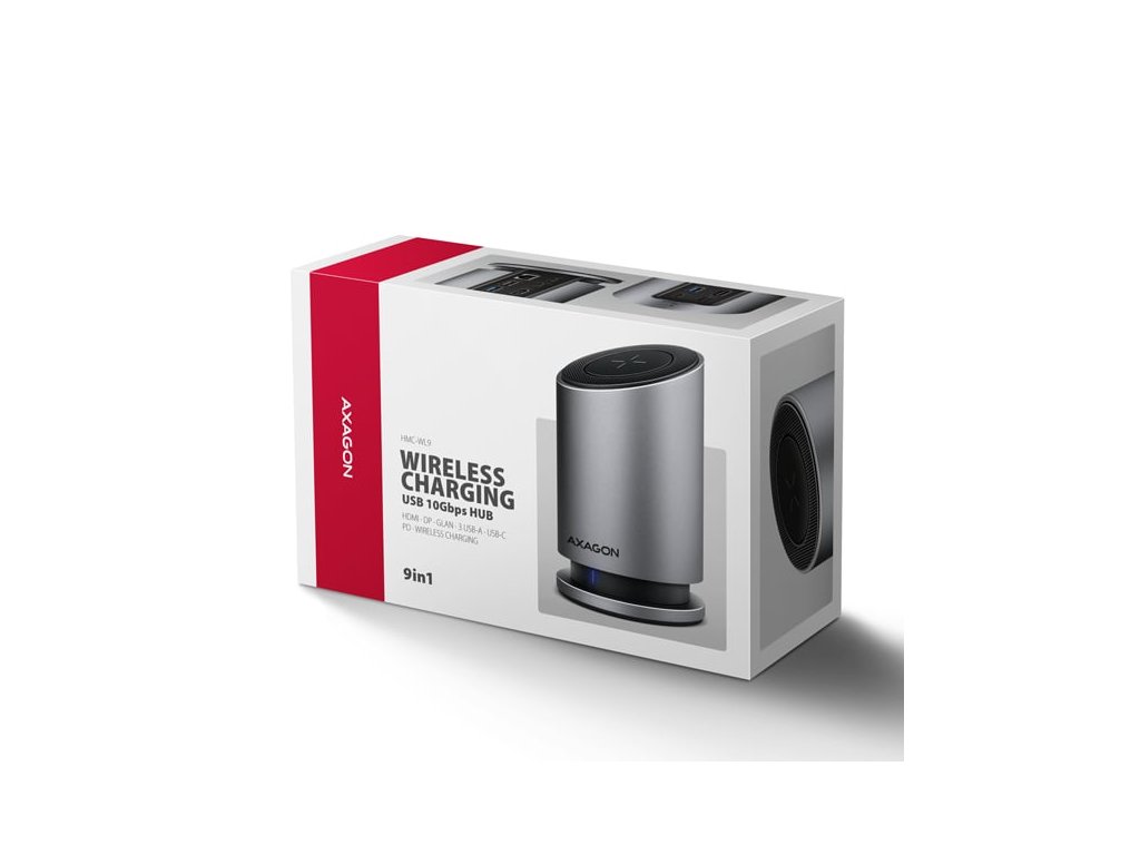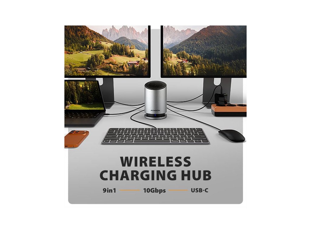 Multiportový USB-C 10Gbps AXAGON HMC-WL9 WIRELESS CHARGING 9in1 hub rozšíří váš notebook, počítač nebo telefon o dva video výstupy, LAN konektor, USB porty a bezdrátovou nabíječku. Váš notebook připojíte k hubu přes 60 cm dlouhý USB-C kabel. Okamžitě tak máte k dispozici připojení pro dva 4K monitory, čtyři USB zařízení a konektor RJ-45 pro Gigabitovou Ethernet síť. Zároveň získáte možnost napájení notebooku pomocí technologie Power Delivery. Díky kompatibilitě s rozhraním Thunderbolt 3/4/5 můžete dokovací stanici 9v1 použít i s notebooky, jako jsou například Apple MacBook Air nebo MacBook Pro.Bezdrátové nabíjení pro mobilní telefony s výkonem až 15 W je integrováno přímo do těla hubu. Díky magnetickému systému uchycení stačí telefon jednoduše přiložit - automaticky se vyrovná do optimální pozice. Nabíjení je tak maximálně efektivní, bezpečné a pohodlné. Samozřejmostí je kompatibilita se standardy Qi1, Qi2 a MagSafe. Pro dosažení maximálního výkonu bezdrátového nabíjení je nutné použít 100W PD nabíjecí adaptér.