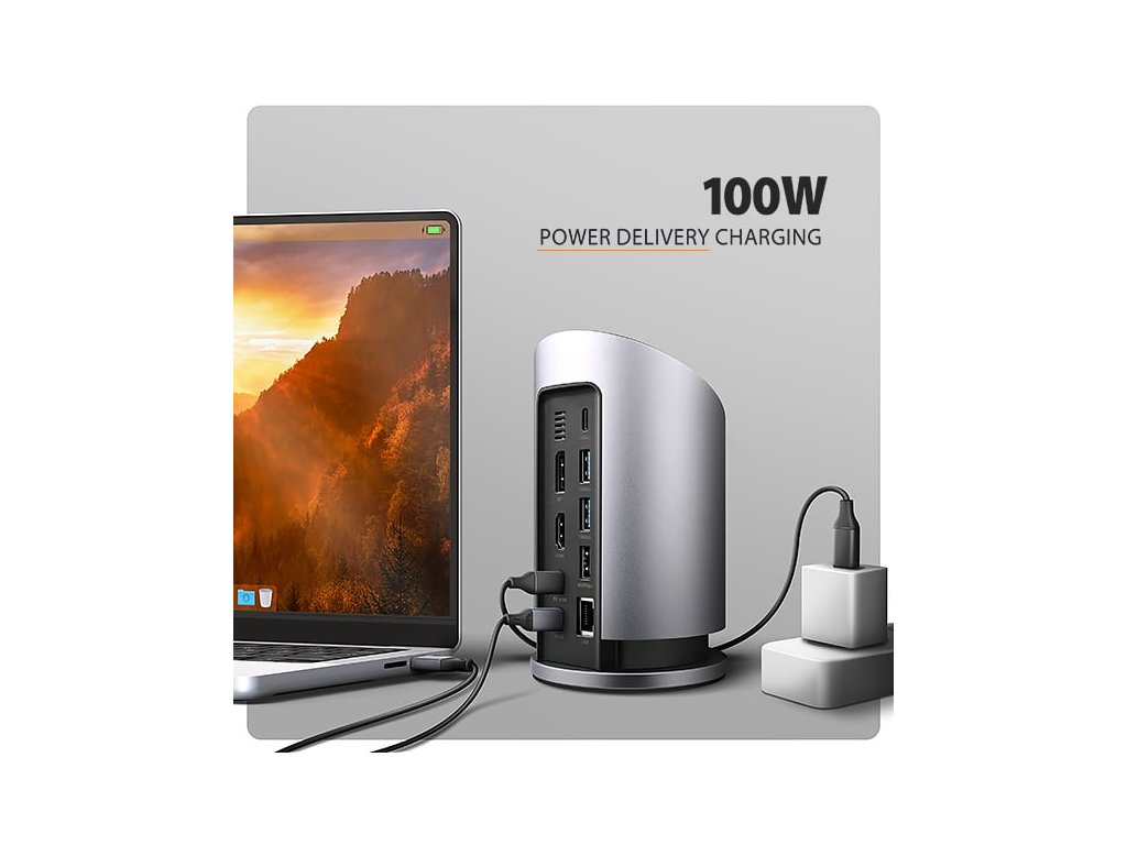 USB-C vstup (PD) je určen pro Power Delivery nabíječku. Díky tomu je jak notebook, tak i dock, napájen přímo z PD nabíječky s využitím technologie Power Delivery 3.0 s výkonem až do 100W.