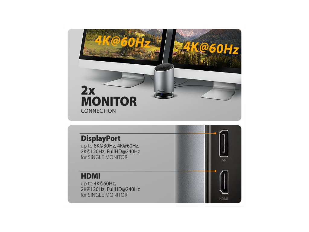 Dva video výstupy - HDMI a DisplayPort umožňují připojení externích monitorů, TV nebo projektorů s rozlišením až 4K/60Hz Ultra HD při zapojení dvou monitorů najednou. Podporována jsou také další rozlišení, například 2K/120Hz Quad HD nebo 1080p/240Hz Full HD a přenos vícekanálového zvuku přes HDMI. Díky podpoře HDR si můžete vychutnat výrazně rozšířený rozsah barev a kontrastů.