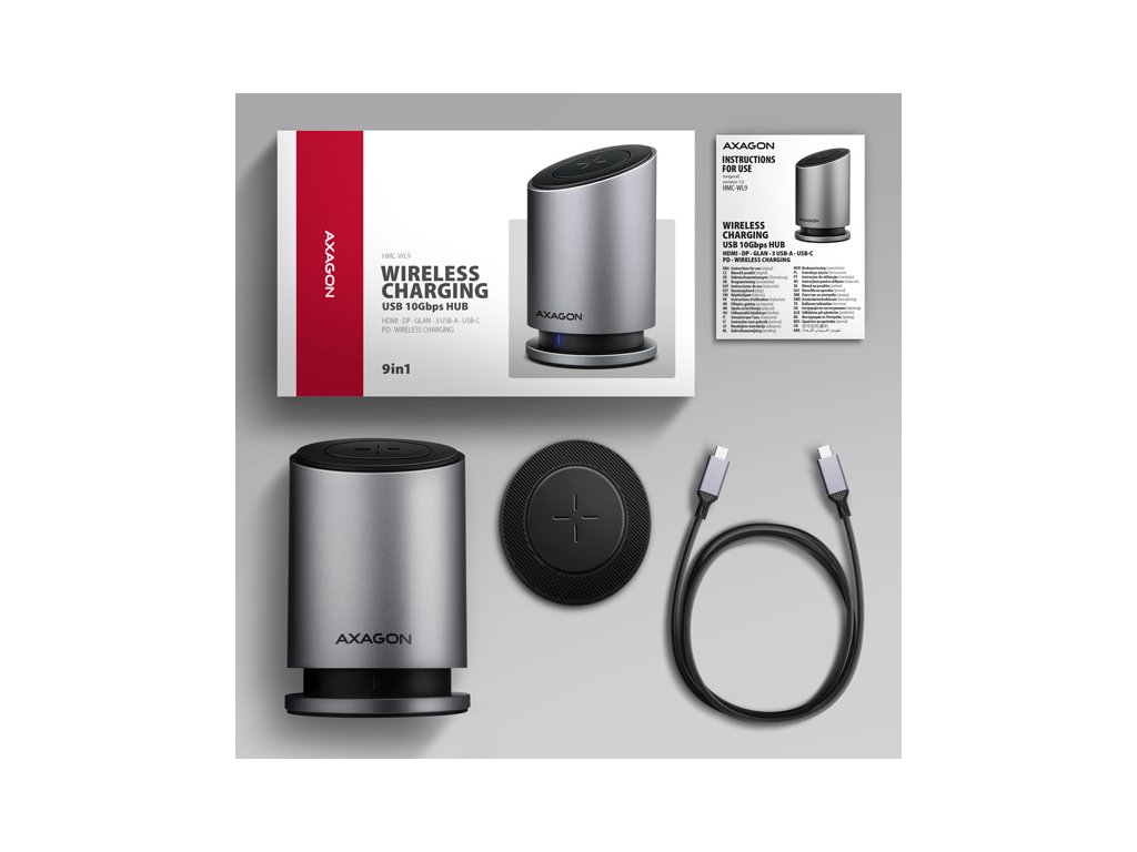 AXAGON HMC-WL9, USB 10Gbps hub s Qi, 3x USB-A, USB-C, HDMI & DP 4k/60Hz, RJ-45 GLAN, PD 100W, kabel USB-C 60cm