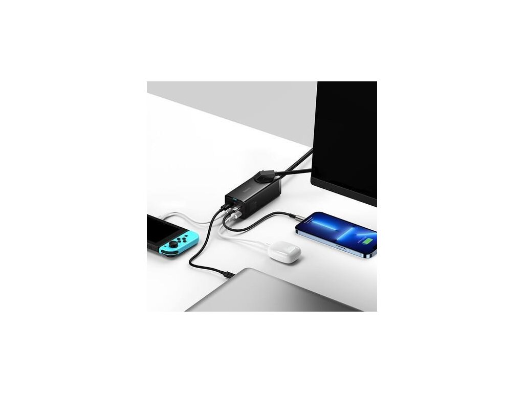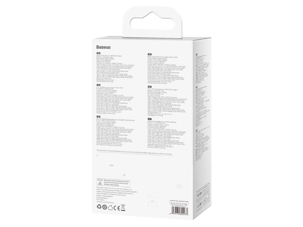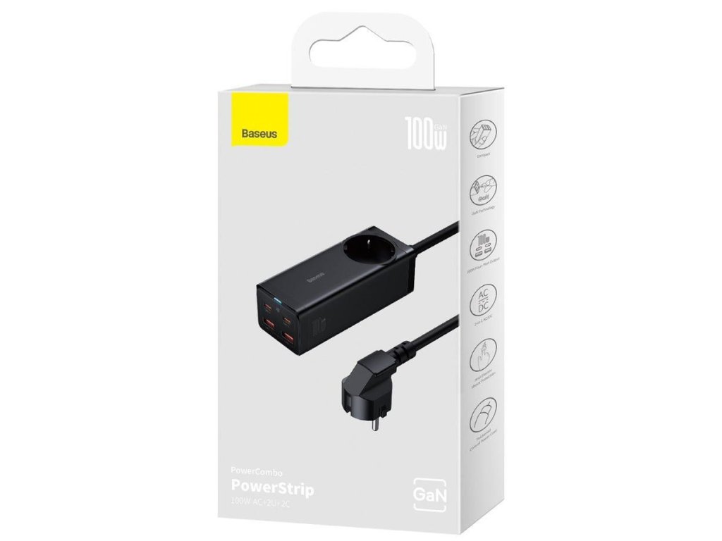 Baseus GaN3 Pro PSZM000401 nabíja až 5 zariadení naraz. Dosahuje maximálny výkon 100 W a podporuje rýchle nabíjanie cez USB-C Power Delivery. Má 2× výstup pre USB-C, 2× pre USB a 1× 230V zásuvku. Podporuje nabíjanie telefónov, notebookov, počítačov a tabletov. Adaptér je kompatibilný s produktmi Apple a Samsung. Nabíjačka s technológiou GaN pre ešte lepší výkon bez prehrievania. Maximálny výstupný proud je 5 A. Kabel s konektorom USB-C dosahuje dĺžku 1,5 m. Síťová nabíjačka s maximálnym výkonom 100 W 2× USB-C, 2× USB a 1× 230 V zásuvka; Nabíja 5 zariadení naraz vrátane telefónu alebo notebooku Podpora rýchleho nabíjania cez USB-C Power Delivery Vybavený technológiou GaN Výrobca/dovozca do EÚ: CPA CZECH sro, U Panasonicu 376, 53006 Pardubice - Staré Čívice, Česká republika, e-mail: cpa@cpac.cz,Dodatočné parametre