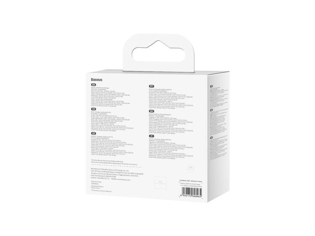 Baseus GaN5 Pro je rýchla univerzálna nabíjačka GaN USB typu USB-C/USB-A s rýchlosťou až 100 W. Revolučný nabíjací adaptér Baseus GaN5 Pro je absolútny hit na trhu, ktorý má reálnu šancu spôsobiť na ňom revolúciu. Prečo? Pretože využíva energiu prúdiacu z nitridu gália namiesto křemíka. GaN je polovodičový materiál, ktorý nielenže zvyšuje účinnosť procesu nabíjania, ale taktiež vyžaduje oveľa menej energie a zaberá minimum miesta. Vďaka tomu je ideálny na mobilné použitie aj v práci alebo na cestách po svete. Je kompatibilný s celosvetovými zásuvkami s normami elektrického napätia od 100 do 240 V. Kompaktný a bezpečný Duálne nabíjanie Značka Baseus použila riešenia, ktoré umožňujú nabíjať rôzne elektronické zariadenia vrátane tých, ktoré vyžadujú vysokú spotrebu energie. Je kompatibilný so systémami iOS a Android. Okrem iného podporuje notebooky, tablety, smartfóny a dokonca aj čističky vzduchu alebo bezdrôtové sluchátka. Je ideálny na nabíjanie notebookov s konektorom USB typu C (100 W). Nabíjať možno dve zariadenia súčasne. Používateľ sa tak nemusí obávať skratu alebo prepätia. Technológia BPS (Baseus power split) umožňuje inteligentné rozdelenie výstupného prúdu pri prevádzke viacerých zariadení. Na zvýšenie komfortu používania nabíjačky Baseus GaN výrobca použil 6 ochranných prvkov vrátane ochrany proti prehriatiu, prepätiu, vysokému napätiu, preťaženiu, nadmernej spotrebe a elektrostatike. Technické špecifikácie Hmotnosť: 229 g Vstupný preud: AC 100-240 V 50/60 Hz max. 2,5 A Výstupný preud: Typ-C1: 5V/3A 9V/3A 1/3A 15V/3A 20V/5A Max USB: 5V/3A 9V/3A typ C + USB: 65W + 30WDodatočné parametre