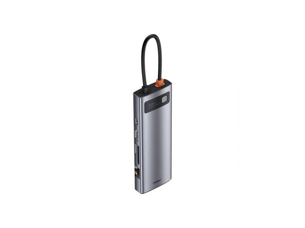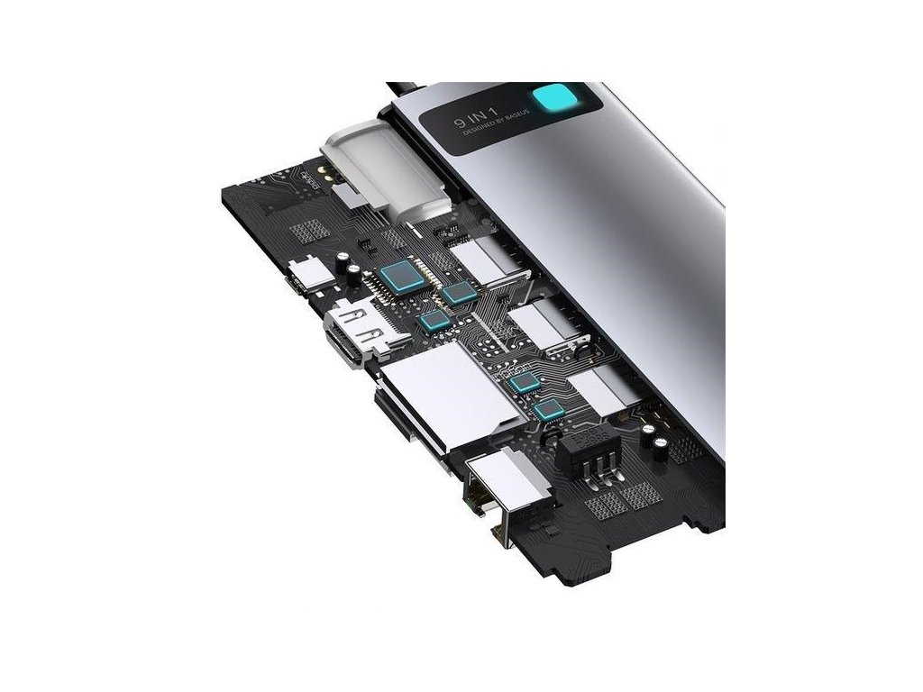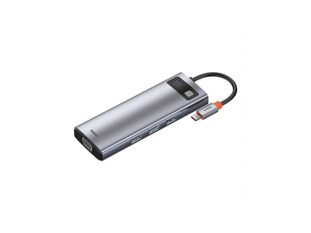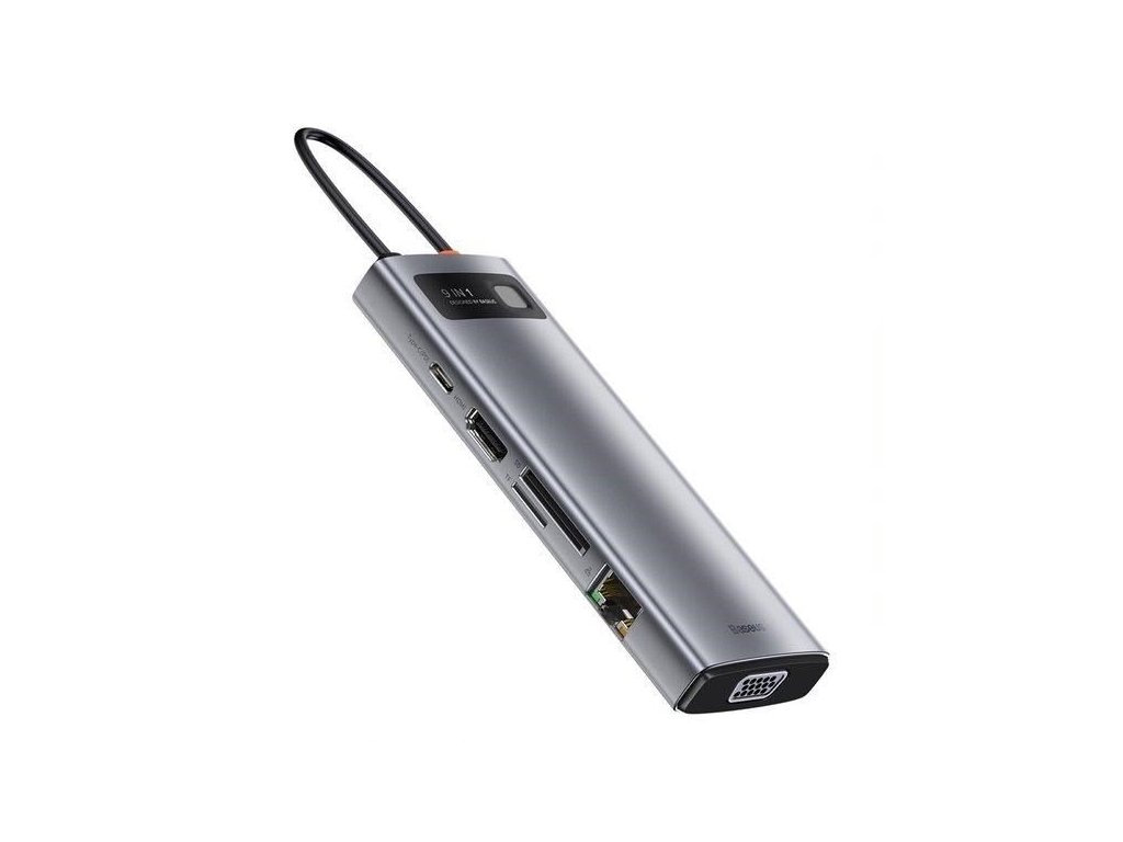 Baseus Metal Gleam Series 9v1 USB-C HUB (USB-C PD 100W, 3* USB 3.0, HDMI, VGA, RJ45, SD/TF port), sivá