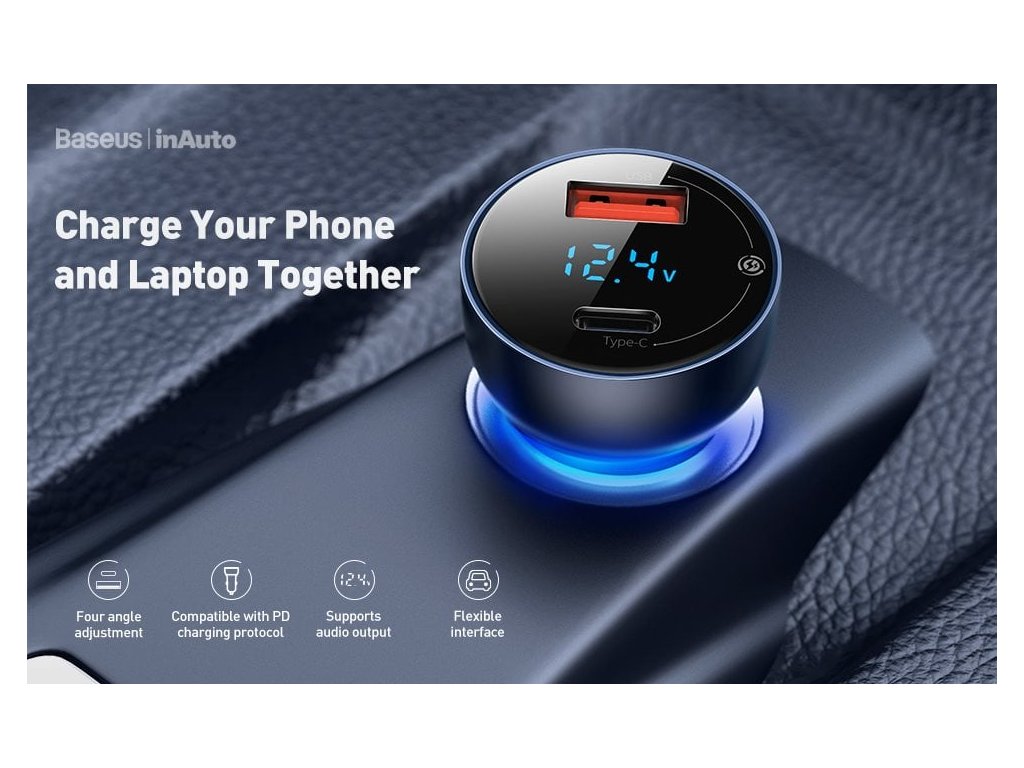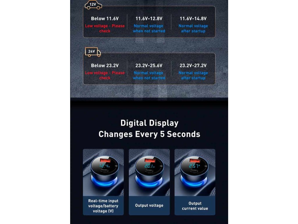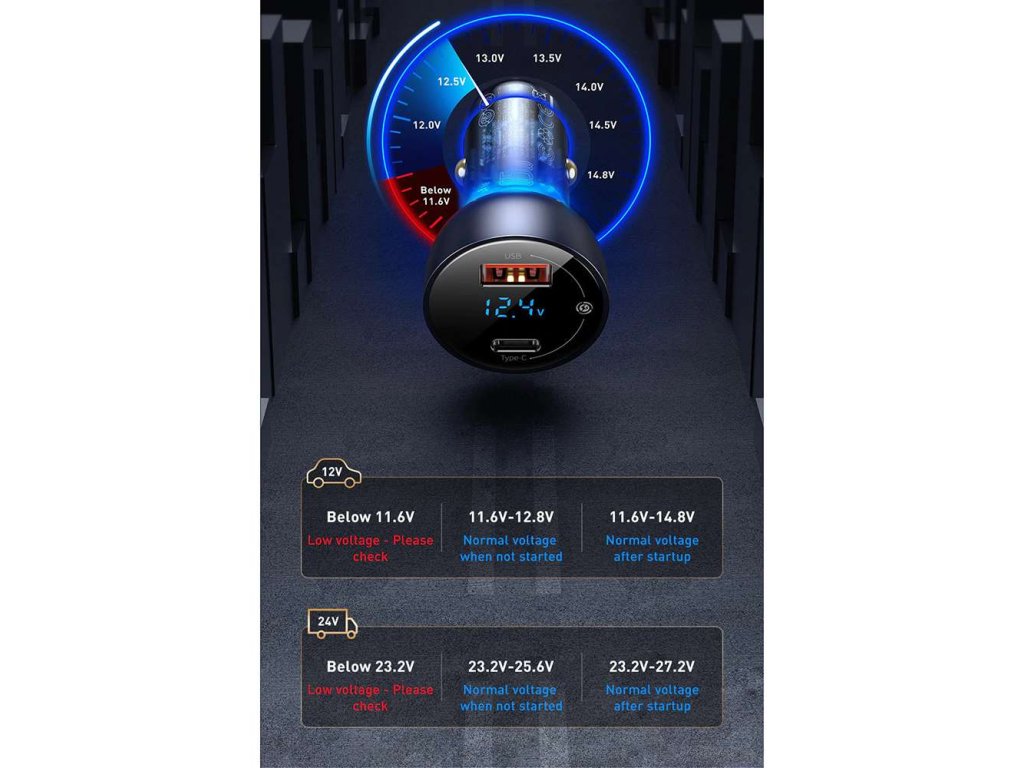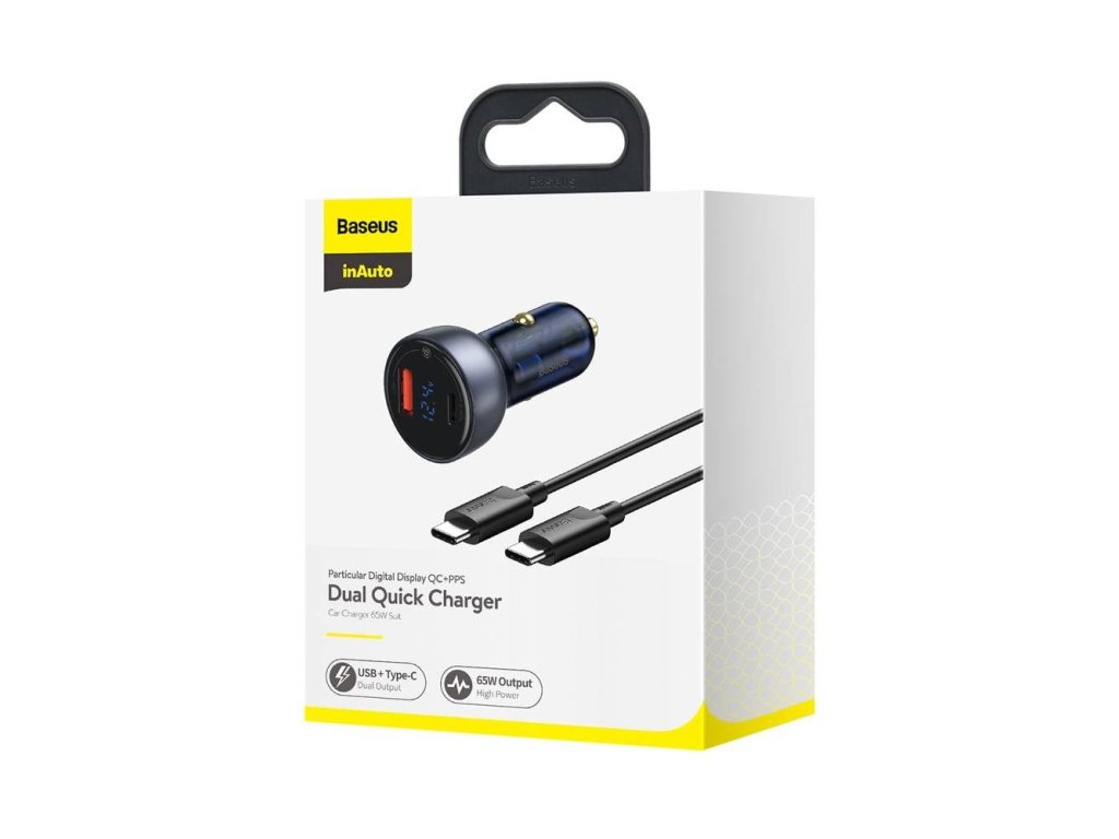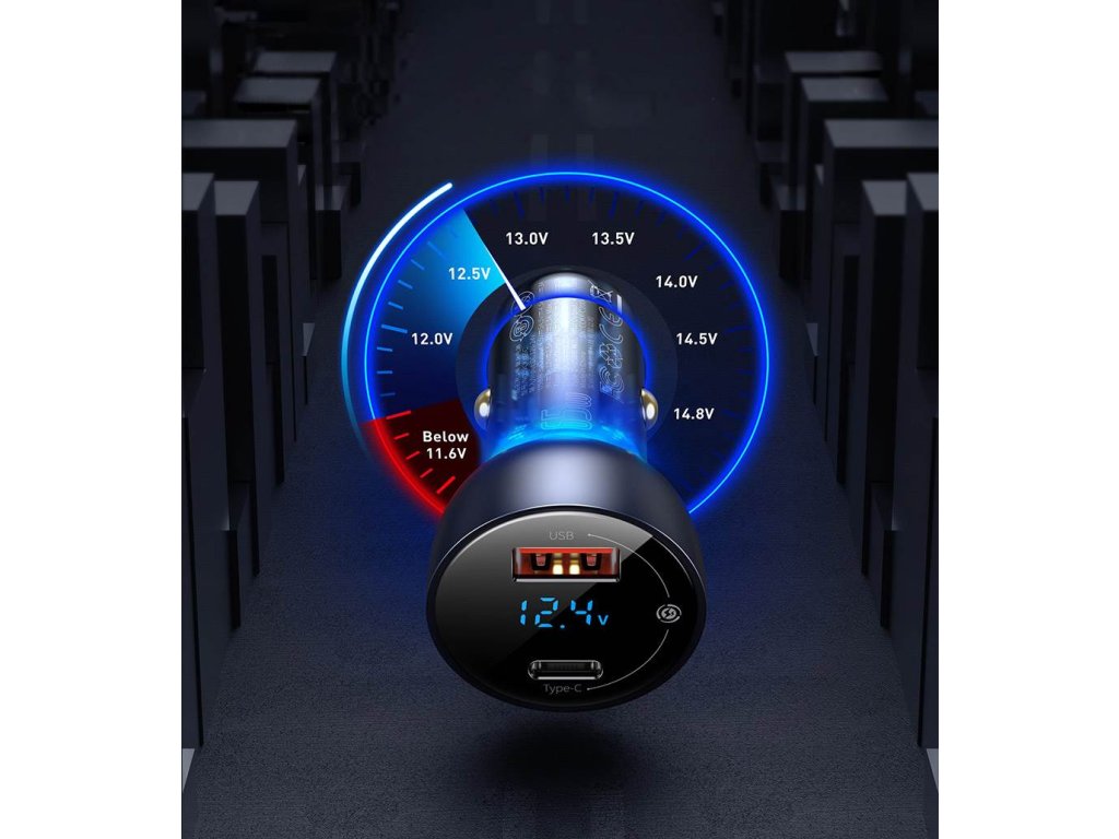 Nabíjačka do auta Baseus Digital Display PPS Dual Quick Car Charger 65WNa nabíjanie zariadení v aute môžete použiť nabíjačku do cigaretového zapaľovača Baseus. Dokáže nabíjať telefón a tablet súčasne. Je vyrobená z kvalitnej hliníkovej zliatiny, ktorá zaručuje dobrý odvod tepla. Určite oceníte výrazný a elegantný digitálny displej.univerzálna kompatibilitaNabíjačka do auta Baseus má automatickú detekciu. Digitálny displej aktualizuje hodnoty každých 5 sekúnd. Nabíjačka funguje so všetkými zásuvkami od 12 do 24 V. V aute tak môžete nabíjať mobilné telefóny, tablety, digitálne fotoaparáty a ďalšie zariadenia.nárazuvzdornáNabíjačka Baseus vás poteší svojou protišmykovou a nárazuvzdornou konštrukciou. Udrží stabilné nepretržité nabíjanie aj na hrboľatých horských cestách. Má ochranu proti prepätiu a podpätiu a obsahuje aj tepelnú poistku.Kľúčové vlastnosti:Vyrobená z vysokokvalitnej hliníkovej zliatinyNabíjačka Baseus nabíja telefón a tablet súčasneUdržuje stabilné nabíjanie aj na hrboľatých cestáchKompatibilná so zásuvkami od 12 do 24 VOOcenite digitálny displejAktualizuje údaje každých 5 sekúndŠpecifikácie: Nabíjačka Baseus je vyrobená z kvalitnej hliníkovej zliatiny:Značka: BaseusMateriál: hliník + ABS + PCVstup: DC 12-24VVeľkosť: 34mm 68mmVýstup USB: 4,5V/5A; 5V/4,5A; 5V/3A; 9V/3A; 12V/2,5A; 20V/1,5A maxVýstup typu C: 5V/3A; 9V/3A; 12V/3A; 15V/3A; 20V/3,25A maxCelkový výkon: 18W + 45W (63W)