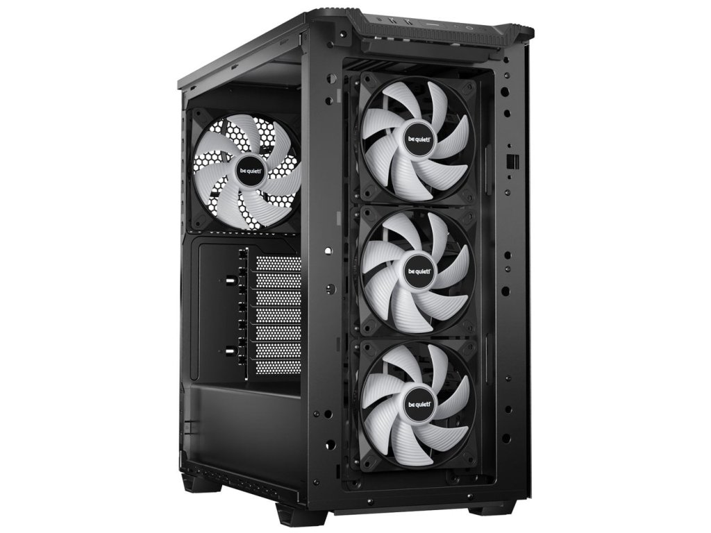 Celá sestava se tak podílí na efektivním odvětrávání a vysokém průtoku vzduchu uvnitř skříně. Konstrukce s otočnými PCIe sloty umožňuje svislou montáž grafických karet, čímž si může dovolit i celkové menší rozměry. Mezi další přednosti patří chytrá správa kabelů, která umožní využít prostor skříně na maximum a přitom efektivně. Na horním panelu skříň Be quiet! PURE BASE 501 LX obsahuje konektory pro připojení hlavních periferií.