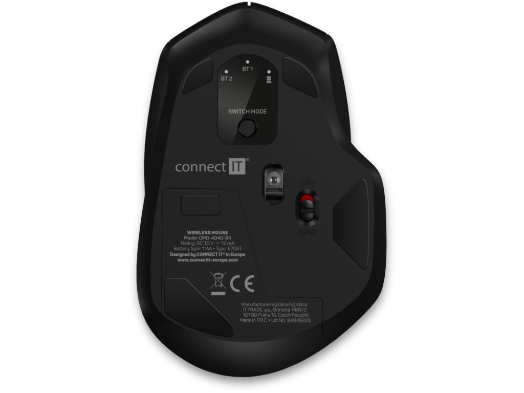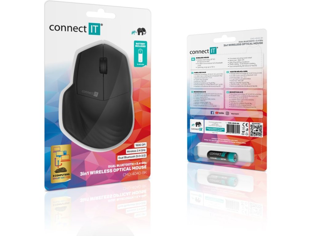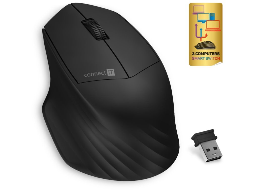 Trojitý prepínač SmartSwitch, čierny --- Tichá bezdrôtová kanceláriská myš s tromi bezdrôtovými profilmi podporujúcimi štandardy Bluetooth 5.0, 3.0 a Wirelless 2,4 GHz, vybavená 2 tichými tlačidlami MuteButtons, rolovacím koleskom a tlačidlom na prepína. --- Unikátna technológia Triple SmartSwitch umožňuje používať myš až na troch zariadeniach, ktoré podporujú Bluetooth 5.0, 3.0 alebo majú vstup USB-A. Táto funkcia je ideálna na profesionálne a domáce použitie všade tam, kde potrebujete pracovať s jednou myšou striedavo na viacerých počítačoch alebo notebookoch. Ľavé a pravé tlačidlo myši sú vybavené technológiou SilentClick s tichým prevádzkou, ktorá pri kliknutí nevydáva žiadny zvuk. Samozrejmosťou je integrovaný úložný priestor pre prijímač USB Nano pod krytom priestoru pre batérie. Súčasťou balenia je originálna alkalická ceruzková batéria CONNECT IT. --- Určené na domáce a kanceláriové profesionálne použitie Technológia SilentClick pre levé a pravé tlačidlo (tlačidlá nevydávajú pri kliknutí žiadny zvuk) Technológia Triple SmartSwitch umožňujúca používanie myši na 3 zariadeniach Rozhranie 2,4 GHz: nano prijímač USB-A (dosah až 10 m) 3 Bezdrôtové profily 5.0 (spätne kompatibilný s Bluetooth 3.0) - Bluetooth 5.0 (spätne kompatibilný s Bluetooth 3.0) Prepínač bezdrátového rozhrania v spodnej časti myši Rozlíšenie optického snímača: 1600 DPI Špeciálne čierne teflónové dráhy "UltraSlides BLACK" do pohotovostného režimu po 30 minútach nečinnosti) Špeciálna ergonomia na zníženie únavy aj pri dlhodobom používaní Vysoká presnosť ideálna aj na prácu v grafických editoroch Jednoduchá inštalácia Plug & Play bez potreby inštalácie a sťahovania ovládačov (stačí pripojiť prijímač USB k portu USB počítača alebo notebooku) 4 tlačítka vrátane rolovacieho rolovacie kolečko s presným ovládaním Prepínač zapnutia/vypnutia na úplné vypnutie myši s cieľom šetriť batériu Úložný priestor v spodnej časti myši pre prijímač USB Nano ideálny na prepravu a cestovanie Napájanie: 1 × alkalická batéria typu AA originálna ceruzková batéria CONNECT IT (súčasťou balenia) Univerzálna kompati operačným systémom Mac OS nemusí fungovať správne) Rozmery (d × š × v): 112 x 74 x 42 mm Hmotnosť bez batérie a bez prijímačov USB: 63 g Hmotnosť s bateriou a bez prijímačov USB: 85 g Farba: čierna --- Obsah balenia: Myš USB-A nano prijímačDodatočné parametre