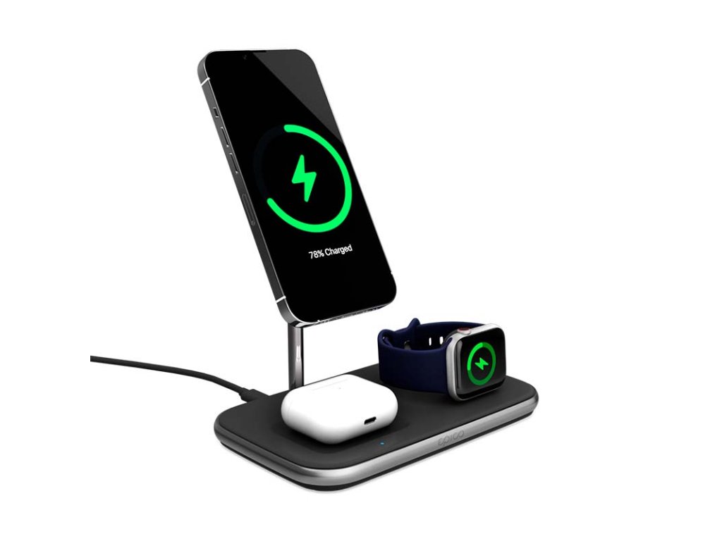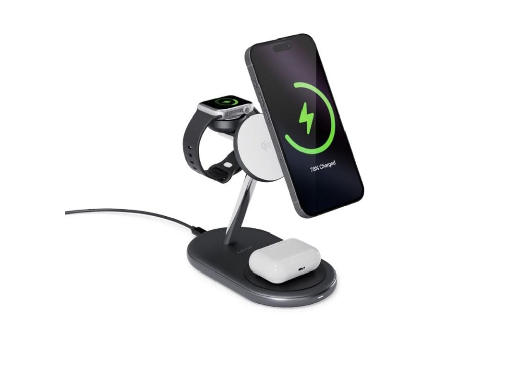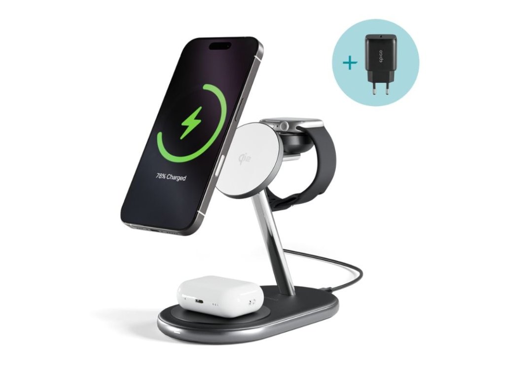 Krásne spracované riešenie pre všetky vaše potreby nabíjania Elegantný dizajn: vyrobený z prvotriednych materiálov, vďaka ktorým sa táto nabíjačka stane krásnym doplnkom vášho stola. Bezdrôtový výstup Qi2: Efektívne bezdrôtové nabíjanie smartfónov s maximálnym výkonom 15 W, ktoré je až 2× rýchlejšie ako štandardné nabíjanie Qi. Nabíjanie 3v1: Umožňuje súčasné nabíjanie smartfónu, hodiniek Apple Watch (5 W) a sluchádiel AirPods (5 W). Certifikované vyrobené pre Apple Watch: Certifikované spoločnosťou Apple, aby sa zabezpečila úplná kompatibilita s budúcimi aktualizáciami a bezchybný výkon. Stabilná gumová základňa: Vybavená protišmykovou gumovou základňou pre lepšiu stabilitu. Flexibilné umiestnenie. Kompletné balenie: Obsahuje 30W sieťovú nabíjačku a kábel USB-C na USB-C.Dodatočné parametre