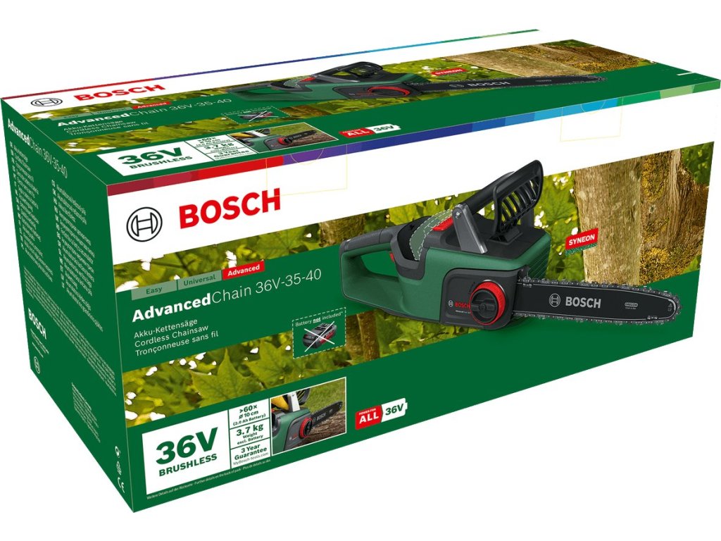 Vďaka výkonnému bezuhlíkovému motoru akumulátorovej reťazovej píly AdvancedChain 36V-35-40 ľahko zvládnete údržbu záhrady a hravo si poradíte s mohutnými vetvami a kmeňmi. Technológia regulácie otáčok OptiCut predvída potenciálne záseky a podľa toho reguluje krútiaci moment, čím zabezpečuje hladké rezanie aj tých najtvrdších tvrdých drevín a větví. Nadšení záhradníci ocenia vyváženú manipuláciu, nízku hmotnosť, pohodlné nastavenie vďaka systému SDS bez použitia náradia a istotu brzdy QuickStop proti spätnému rázu. Zabudovaná technológia Bosch Syneon poskytuje optimálny výkon a maximálny čas prevádzky. Toto náradie patrí do systému 36 V POWER FOR ALL. Jeden akumulátor možno používať so všetkými 36 V POWER FOR ALL náradiami. Technické údaje Napätie akumulátora 36 V Kompatibilita batérie 36 V NAPÁJANIE PRE VŠETKÝCH Doporučené batérie >= 2,0 Ah Čas nabíjania batérie 65 min Zásobník oleja 150 ml Počet rezov na jedno nabitie batérie 2,0 Ah > 60 rezov Dĺžka tyče 35 cm Rýchl 1,1 mm Reťaz Reťaz Oregon Rozstup reťaze 3/8" Priemer rezania 310 mm Automatické mazanie olejom Áno Počet hnacích článkov 52 Rozmery nástroja (D × Š × V) 787 x 233 x 229 mm Hmotnosť (včítane reťaze a lišty) 3,5 kg Priložené Vodiaca lišta 1× reťazová píla, 35 cm Kryt reťaze Olej na reťazovú pilu 50 ml Stručná príručka KartónDodatočné parametre