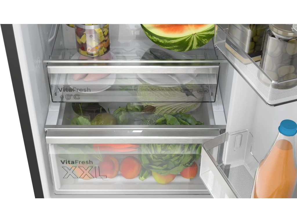Zásuvky VitaFresh sú veľmi priestranné a ponúkajú dostatok miesta pre všetky vaše čerstvé potraviny. Zásuvka XXL je určená na ovocie a zeleninu, ktorým prospieva optimálna vlhkosť na zachovanie vitamínov. Pre ryby a mäso je ideálna teplota blízka <0 °C>. Viac potravín na vychutnanie, menej odpadu.