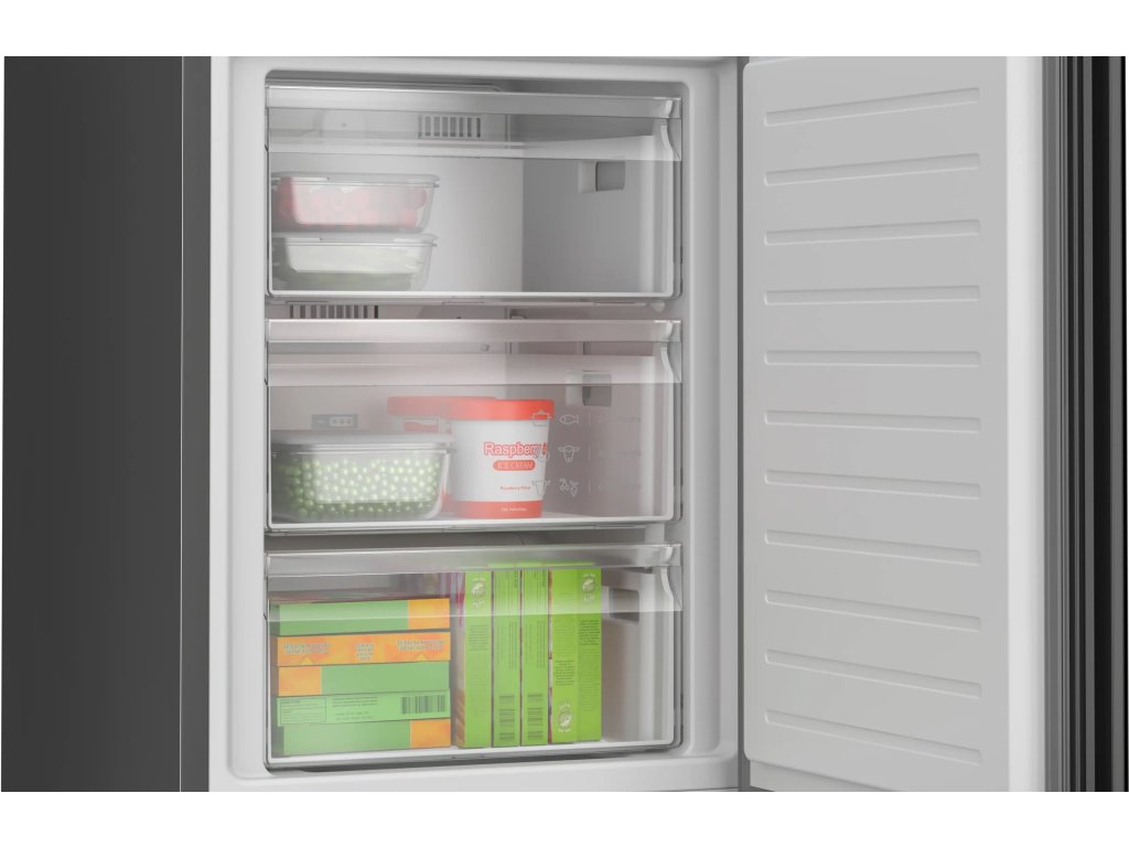 Bosch KGN39LBCFTáto chladnička vás oslní svojím elegantným čiernym dizajnom. A nielen to. Voľne stojaca chladnička s mrazničkou Bosch KGN39LBCF ponúka chladiaci objem 260 l a mraziaci objem 103 l. Vďaka systému Total No Frost je chladnička beznámrazový spotrebič. V mrazničke sa nebude tvoriť ľad a vy ju už nikdy nebudete musieť odmrazovať. Systém zabraňuje tvorbe nežiaducich kvapiek vody na zadnej strane chladničky. V zásuvkách VitaFresh je možné nastaviť teplotu a vlhkosť v závislosti od obsahu. Systém MultiAirflow zabezpečuje stálu cirkuláciu chladného vzduchu. V celej chladničke sa tak udržiava konštantná teplota. Chladnička a mraznička majú funkcie SuperChill a SuperFreeze, pri ktorých sa rýchlo a dočasne zníži teplota. Poličky z bezpečnostného skla majú funkciu priebežného vysúvania, ktorá je veľmi pohodlná a umožňuje vám mať prehľad o zásobách surovín. Jedna polica je deliteľná a dá sa sklopiť až dozadu - ideálny priestor pre veľké riady alebo hrnce. Vďaka kondenzačnej technológii Perfect Fit môžete chladničku zasunúť až k stene alebo bočnému nábytku. Ak zabudnete zatvoriť dvere chladničky, upozorní vás na to varovný signál.