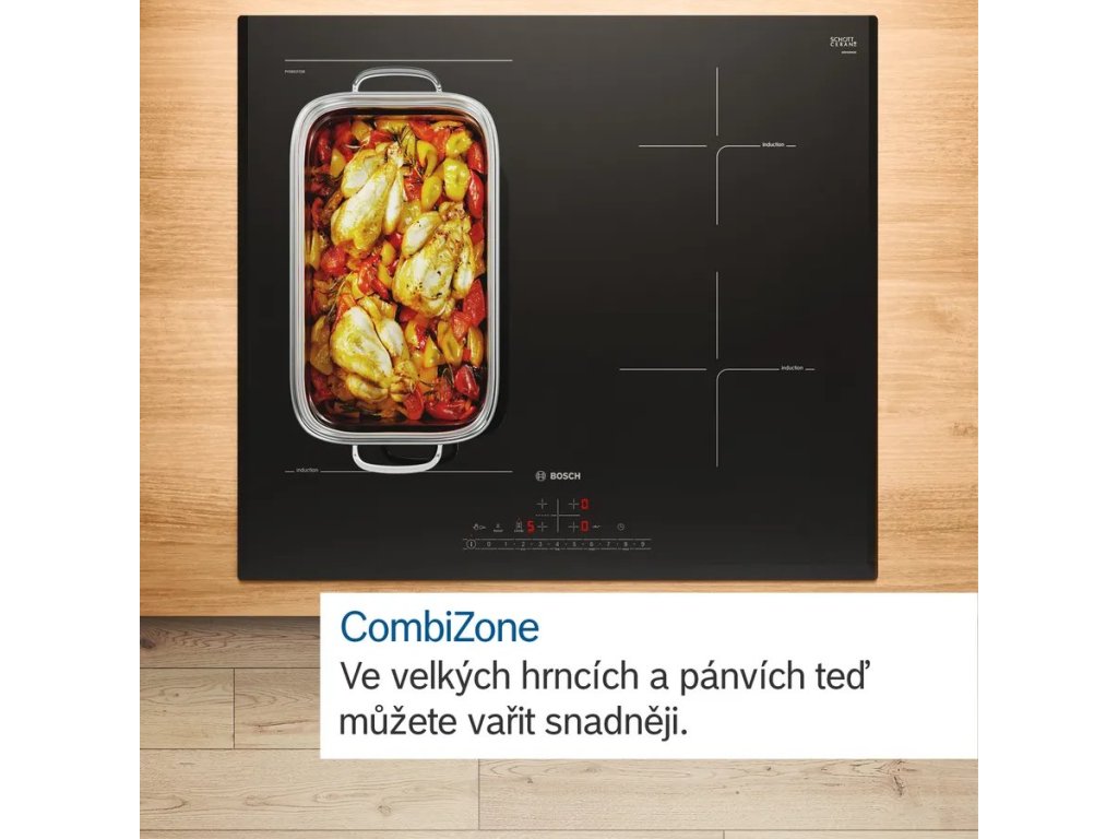 Špeciálne funkcie DirectSelect+: Priama a jednoduchá voľba požadovanej varnej zóny, výkonu a ďalších funkcií. CombiZone: Spojte dve indukčné varné zóny a získajte priestor pre rozmerný riad. PerfectFry Plus: Už sa nemusíte obávať pripálenia. Smart Hood Automatic: Zodpovedajúci odsávač pár sa počas varenia automaticky prispôsobí nastaveniu varnej dosky. Tlačidlo Obľúbené: Prispôsobte si varnú dosku pomocou funkcie Home Connect. Dizajn Typ varnej dosky: indukčná varná doska Materiál dosky: sklokeramika Farba spotrebiča: čierna Typ rámčeka: fazetový design Ochrana skla: Nie Inštalácia Rozmery spotrebiča: 51 x 592 x 522 mm Šírka spotrebiča: 60 cm Požadovaná veľkosť otvoru pre inštaláciu (vx š x0 1 490-500 mm Minimálna hrúbka pracovnej dosky: 16 mm Príkon: 6900 W Dĺžka prívodného kábla: 110,0 cm Typ zástrčky: bez zástrčky (elektrické pripojenie elektrikárom) Flexibilita varných zón Počet varných zón, ktoré môžu byť použité súčasne: 4 Flexibilita var zón: 1 x (38,0 x 21,0 cm) 1 x (14,5 cm O) 1 x (18,0 cm O) Výkon varných zón: 1 x 1,6 (2,2) kW 1 x 2,0 (3,1) kW 2 x 2,5 (3,7) kW Počet varných zón pre u activeLight: Nie Tlačidlo Obľúbené: Áno Počet stupňov výkonu: 17 stupňov výkonu Funkcia udržiavania tepla: Nie Časovač: časovač vypnutia (na spotrebiči), časovač odpočítavania (je možné zvoliť miesto časovača vypnutia) Úspora času a efektivita Funkcia Boost: všetky varné zóny PanBoost: Možnosť voľby pomocou tlačidla Obľúbené/aplik. 2024 prostredníctvom aktualizácie softvéru pre spotrebiče pripojené k Home Connect) Automatické spustenie varu: Nie Automatické spojenie/oddelenie varných zón: Nie Zvýšenie/zníženie úrovne výkonu pomocou MoveMode: Nie Automatický prenos nastavenia: Nie Automatický výber zóny: Nie Quick Start: Áno ReStart: Áno Rýchle vypnutie: Nie Zobrazenie s assistant: K dispozícii prostredníctvom aplikácie Home Connect (očakávaná dostupnosť v 4. štvrťroku 2024 prostredníctvom aktualizácie softvéru pre spotrebiče pripojené k Home Connect) PerfectCook: Nie PerfectCook ready: Nie Vyhnite sa popáleniu vďaka smažiacemu senzoru: fryingSensor Pro Konektivita Automatic: Áno, s príslušným odsávačom pár a pripojeným účtom Home Connect Smart Home Trigger pre individuálnu konfiguráciu: prostredníctvom tlačidla Obľúbené (k dispozícii s pripojeným účtom Home Connect, nutná partnerská služba) Možnosť aktualizovať spotrebič najnovšou verziou softvéru: Áno (k dispozícii s pripojeným účtom Home Connect) Spotreba energie v pohotovostnom režime/0 režimu/siete: 20,0 min Čas automatického pohotovostného režimu/vypnutý displej: 20,0 min Spotreba energie v pohotovostnom režime/siete (spôsob vypnutia modulu Wi-Fi nájdete v užívateľskej príručke): 2,0 W Bezpečnosť Ukazovateľ zvyškového tepla: Áno Bezpečnostné zariadenie: detská poistka, funkcia pauza, funkcia pauza ukazovateľov: 0Dodatočné parametre