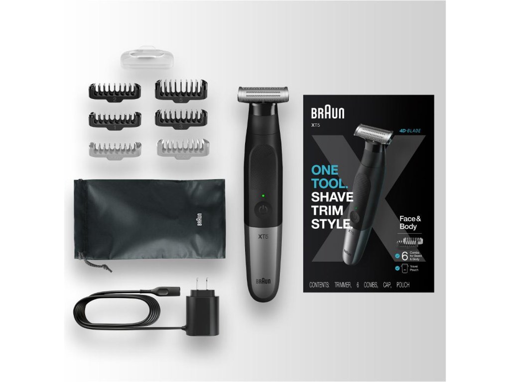 Vadí vám, ako každý strojček zvládne niečo iné? Braun Series X XT5200 sa vďaka výmenným nástavcom dokáže postarať o holenie, zastrihovanie a zarovnávanie. Je určený pre fúzy (hrebene 1, 2, 3 a 5 mm) a tiež úpravu tela (hrebene 0 a 3 mm). Je jedno, či sa radšej holíte nasucho, s gélom alebo penou. Strojček je plne vodotesný, možno si ho vziať napríklad aj do sprchy. Uľahčuje to aj jeho údržbu, pretože ho možno po použití dokonale umyť. Základom presného zastrihovania a dokonale hladkého oholenia je technológia 4D-Blade. Jedna hlava má hneď štyri prvky: dva bočné zastrihávače a dve centrálne holiace zóny. Všetko urobí 450 pohybov za sekundu, čo nielen urýchli holenie, ale zabráni podráždeniu pokožky. Hlava je vyrobená z nerezovej ocele a vydrží ostrá až 6 mesiacov. Hlava zastrihávača a holiaceho strojčeka ďalej obsahuje hrebeň SkinGuard, ktorý chráni vašu pokožku aj v chúlostivých miestach – od hrudníka, podpazušia alebo slabín po tvár, krk alebo obočie.Dodatočné parametre