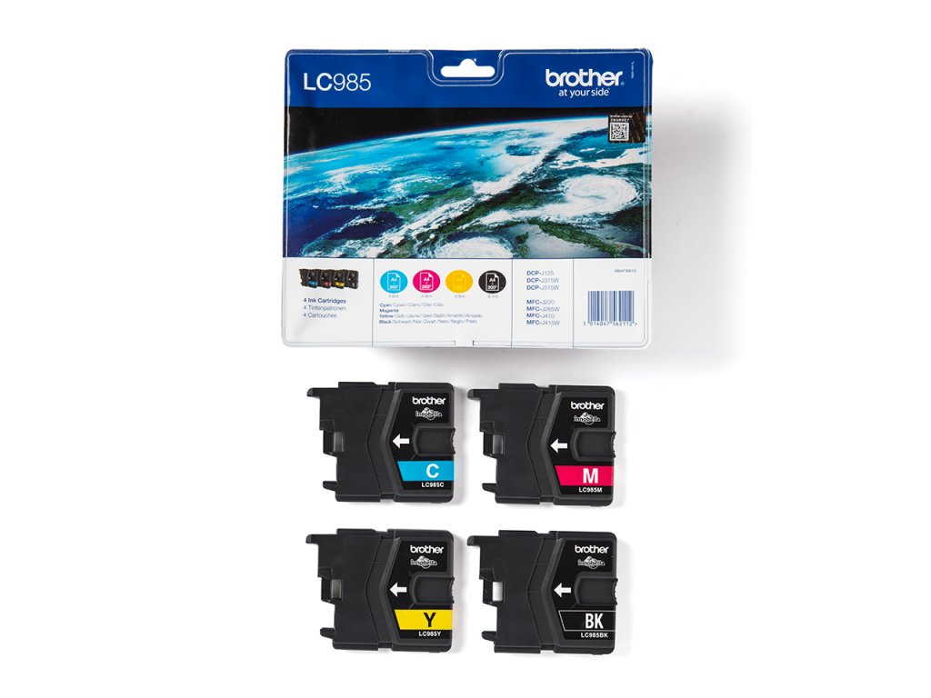 Sada kaziet Brother LC985VALBP s čiernym, azúrovým, purpurovým a žltým atramentom. Čierna kazeta vytlačí 350 strán, každá farebná kazeta vytlačí 260 strán.Dodatočné parametre