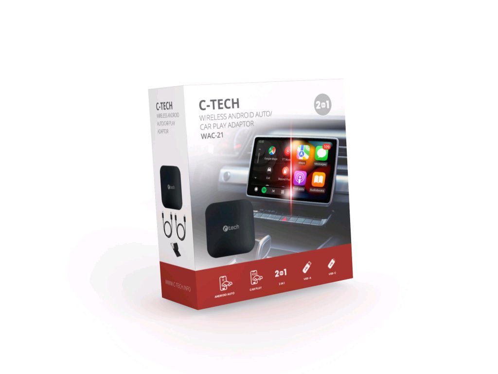 Kombinovaný adaptér pre bezdrôtový systém Android Auto a Car Play Užite si úplnú slobodu a pohodlie s kombinovaným adaptérom C-TECH WAC-21, ktorý umožňuje jednoduché pripojenie vášho vozidla k bezdrôtovým verziám Android Auto a Car Play. Tento jedinečný adaptér kombinuje funkcie pre obe platformy, čo znamená, že bez ohledu na to, aký telefón máte – vždy budete mať prístup k svojim obľúbeným funkciám, aplikáciám a službám priamo na obrazovke palubného počítača vášho vozidla. Kľúčové vlastnosti: - Podpora Android Auto a Car Play: adaptér je plne kompatibilný s oboma platformami, čím zabezpečuje bezproblémové prepínanie medzi zariadeniami s rôznymi operačnými systémami bez potreby opätovnej konfigurácie alebo zložitého párovania. - Už žiadne káble! Tento adaptér umožňuje bezdrôtové pripojenie, takže váš mobilný telefón môže zostať v kapse alebo v taške. Vychutnajte si čistý interiér a väčšiu voľnosť pohybu. - Rýchle a stabilné pripojenie. Vychutnajte si okamžitú odozvu pri používaní aplikácií a hlasových asistentov, či už pri navigácii, telefonovaní alebo počúvaní hudby. - Jednoduchá inštalácia: stačí pripojiť adaptér do portu USB v aute, spárovať ho s telefónom a môžete vyraziť! Nie je potrebný žiadny zložitý softvér ani odborné nastavenie. Súčasťou balenia je kábel USB-A aj kábel USB-C. - Adaptér je kompatibilný s väčšinou vozidiel podporujúcich funkcie Car Play a Android Auto, takže je univerzálnym riešením pre väčšinu moderných automobilov (treba overiť u výrobcu vozidla). Adaptéry musia byť overené výrobcom, aby sa zabezpečila kompatibilita adaptéra s Car Play a Android Auto. S týmto adaptérom budete môcť používať svoje obľúbené aplikácie pre navigáciu, hudbu, telefonovanie, správu a ďalšie funkcie priamo na obrazovke vozidla bez potreby pripájania káblov. Získate plný prístup k aplikáciám Google Maps, Waze, Spotify, hands-free volaniam a ďalším bez toho, aby ste museli držať telefón. Ako to funguje? Jednoducho pripojte adaptér do portu USB kompatibilného vozidla a spárujte ho s telefónom. Po spárovaní sa adaptér automaticky rozpozná a pripojí sa k telefónu vždy, keď naštartujete vozidlo. Obsah balenia: 1× adaptér WAC-21 1× kábel USB-A + USB-C 1x 3M nálepka na suchý zips na upevnenie adaptéra 1× užívateľská príručka Špecifikácia Veľkosť: 63×63×15 mm Pripojenie: USB-A/USB-C Napájanie: 5V/210. 11.0/IOS 10 a novějšíDodatočné parametre
