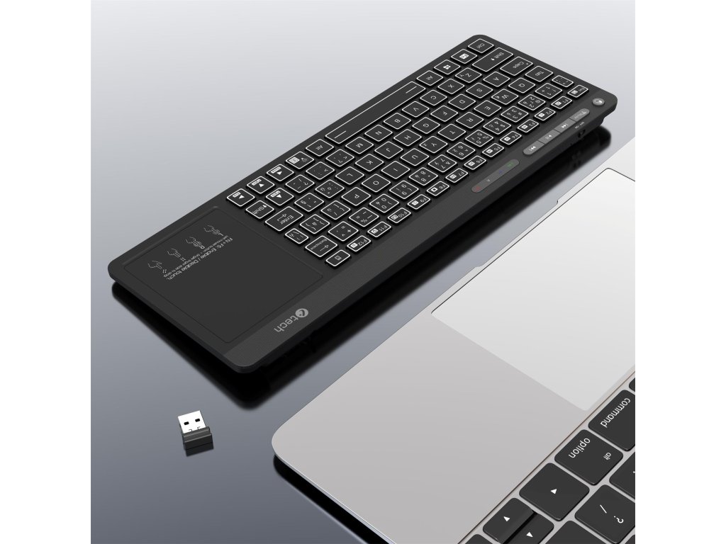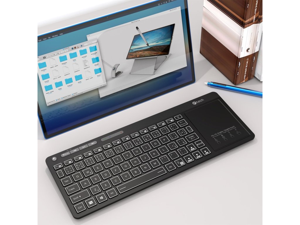 C-TECH WLTK-03 - Elegantná bezdrôtová klávesnica s touchpadom, podsvietením a maximálnym komfortom Štýlová, spolehlivá a plne vybavená nová bezdrôtová klávesnica C-TECH WLTK-03 posúva mobilitu a užívateľský komfort na novú úroveň. Vďaka kompaktnému dizajnu s integrovaným touchpadom, duálnemu bezdrôtovému pripojeniu a predovšetkým atraktívnemu LED podsvieteniu klávesov je ideálna na prácu vo dne aj v noci, doma aj na cestách. Dve možnosti pripojenia - vždy pripravený WLTK-03 podporuje pripojenie Bluetooth 5.0 aj 2,4 GHz prostredníctvom USB kľúča, takže si môžete vybrať najvhodnejší spôsob komunikácie v závislosti od používaného zariadenia. Vďaka dosahu až 10 metrov vás nebudú omedzovať káble. Nôžnicové spínače - tiché a pohodlné písanie Každé stlačenie klávesu na zariadení WLTK-03 je presné, plynulé a tiché - vďaka nôžnicovým spínačom. Tento osvedčený mechanizmus, známy z prémiových notebookov, poskytuje: rýchlu a citlivú odozvu vďaka nízkemu zdvihu klávesov, pohodlné a stabilné stláčanie bez váhania, výrazne nižšiu hlučnosť ako bežné membránové klávesnice, vysokú odolnosť a spoľahlivosť pri každodennom používaní. Vďaka tomu je klávesnica WLTK-03 ideálna na dlhé písanie, kanceláriu prácu a pokojné večerné používanie bez rušenia okolia. Dotyková podložka namiesto myši Klávesnica obsahuje touchpad plnej veľkosti, ktorý úplne nahrazuje externú myš. Kurzor, kliknutia a základné gestá môžete ovládať priamo z klávesnice - to je obzvlášť praktické pri ovládaní inteligentného televízora, tabletu alebo pri práci v obmedzenom priestore. Výkonná batéria a pokročilé nabíjanie cez USB-C Srdcom zariadenie je vstavaná 400mAh batéria, ktorá ponúka dlhú výdrž a pohodlné nabíjanie prostredníctvom moderného konektora USB typu C. To znamená rýchlejšie nabíjanie, vyššiu spoľahlivosť a maximálnu kompatibilitu s dnešnými zariadeniami. Štýlové LED podsvietenie - dizajn a funkčnosť Klávesnica WLTK-03 je vybavená jemným bielym LED podsvietením, ktoré nielenže zvyšuje viditeľnosť klávesov v tme, ale zároveň dodáva celej klávesnici moderný a technologicky elegantný vzhľad. Oceníte ho pri večernej práci, sledovaní filmov a prezentáciách v tmavom prostredí. Podsvietenie sa dá samozrejme jednoducho zapnúť alebo vypnúť podľa potreby. Špecifikácia : 83 kláves vrátane 13 multimediálnych skratiek Podsvietenie LED - príjemné a funkčné v každom prostredí Bezdrôtové pripojenie Bluetooth 5.0 + 2,4 GHz prijímač USB Nôžnicové spínače - tiché, pohodlné, presné Touchpad s podporou gest Zabudovaná batéria s kapacitou 400 mA. až 10 metrov Podpora operačných systémov: Windows 10/11, Android Plug & Play - nie je potrebné inštalovať ovládače Čierne telo s matným povrchom Rozmery: 450 x 95 x 25 mm Hmotnosť: 330 gDodatočné parametre