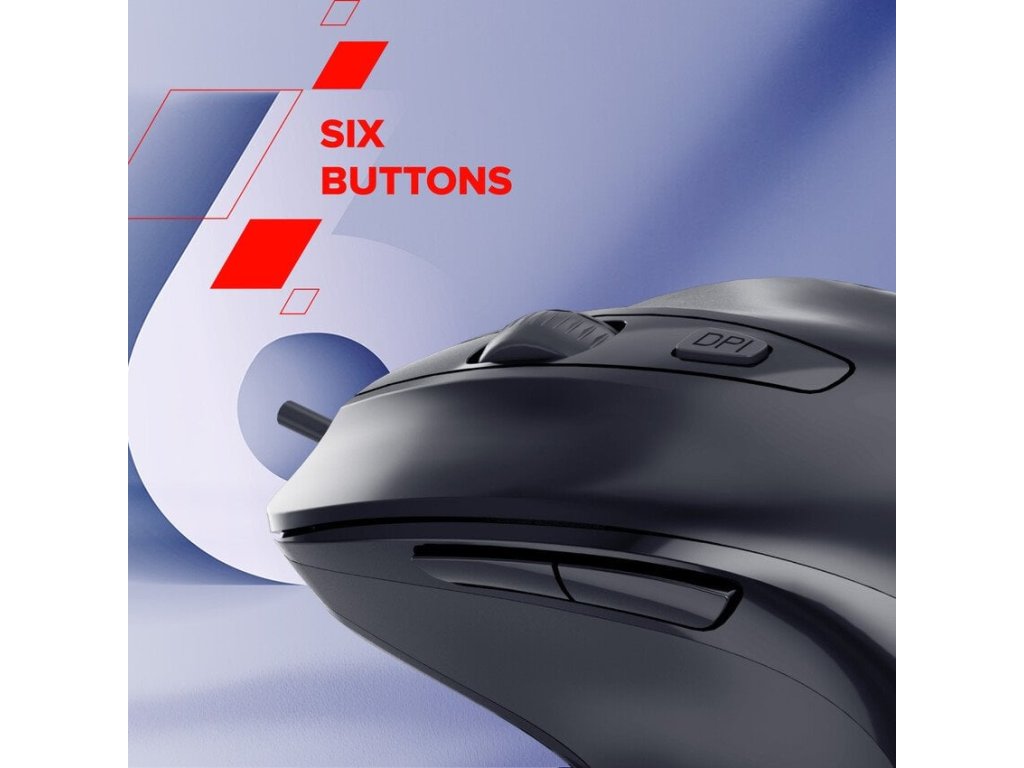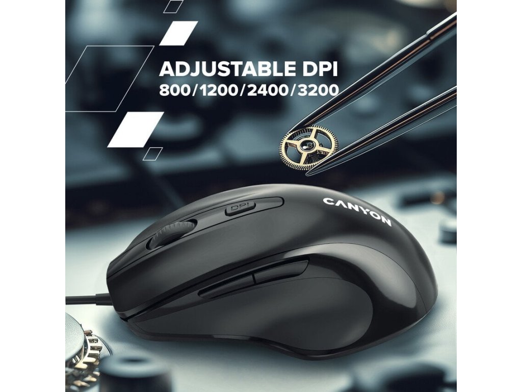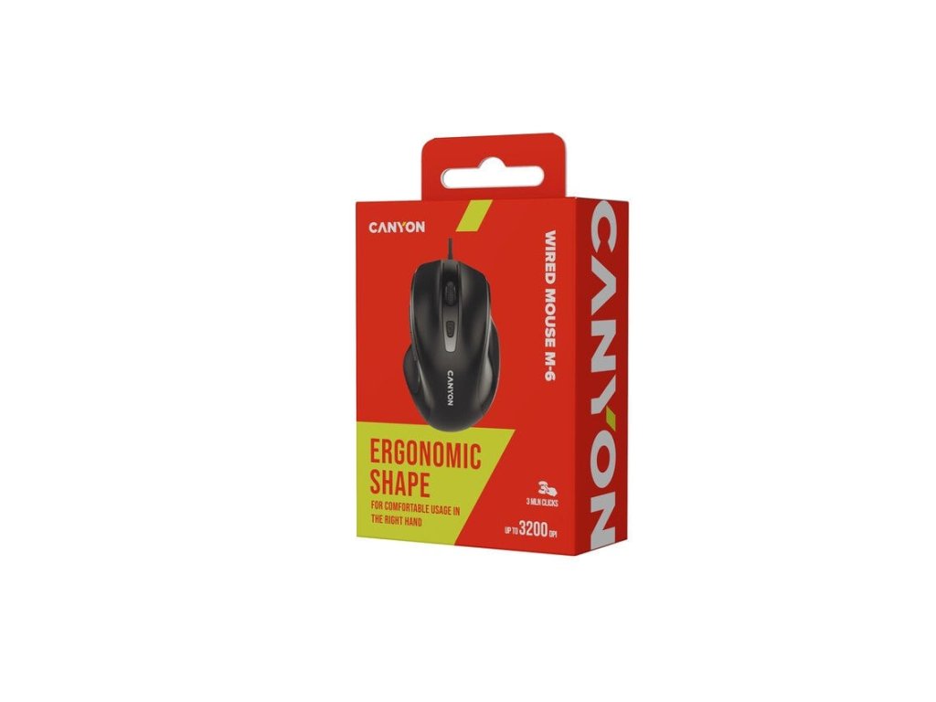 Canyon M-6 – Herní a pracovní drátová myš s nastavitelným DPI Přesnost, pohodlí a odolnost v jednom zařízení. Myš Canyon M-6 je navržena pro každodenní práci i hraní her. Díky ergonomickému tvaru a optickému senzoru s rozlišením až 3200 DPI poskytuje přesné ovládání a pohodlné používání i při delší práci. Nabízí 6 tlačítek, včetně přepínače DPI a bočních tlačítek pro snadný multitasking. Její odolnost až 3 miliony kliknutí, 1,5m kabel a nízká hmotnost z ní dělají spolehlivého partnera pro každou situaci. Hlavní výhody: Optický senzor s nastavitelným DPI: 800 / 1200 / 2400 / 3200 Ergonomický tvar pro pohodlné dlouhodobé používání 6 tlačítek – včetně přepínače DPI, vpřed a zpět Odolnost až 3 miliony kliknutí Kabel o délce 1,5 m pro volný pohyb Nízká hmotnost – pouze 80 g Frekvence snímání 125 Hz a zrychlení 8G pro rychlou odezvu Kompaktní rozměry: 109,5 × 72 × 40 mm Plug & Play – bez nutnosti instalace ovladačů odkaz na web: https://czech.canyon.eu/product/cne-cms6/Dodatočné parametre