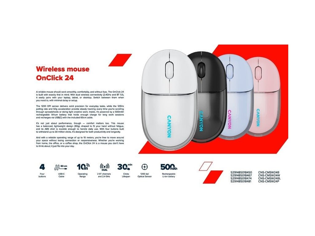 Canyon OnClick 24 – Bezdrátová myš s duálním připojením a tichým chodem Hledáte spolehlivou a stylovou bezdrátovou myš pro každodenní práci? Canyon OnClick 24 je ideální volbou pro domácí i kancelářské použití. Nabízí pohodlné ovládání, moderní design a praktické funkce, které vám usnadní každodenní činnosti. Díky duálnímu připojení (2.4GHz a Bluetooth 5.1) můžete snadno přepínat mezi dvěma zařízeními bez nutnosti znovu párovat. Tichá tlačítka oceníte při práci v tichém prostředí, zatímco vestavěná baterie s kapacitou 500 mAh zajistí dlouhou výdrž bez nutnosti častého nabíjení. Ergonomický tvar a nízká hmotnost zaručují pohodlí i při delším používání. Hlavní výhody: Duální bezdrátové připojení – 2.4GHz a Bluetooth 5.1 Vestavěná dobíjecí baterie s kapacitou 500 mAh Tichá tlačítka pro nerušenou práci Přesný optický senzor s rozlišením 1200 DPI Ergonomický a lehký design (90 g) Dlouhá životnost tlačítek – až 30 milionů kliknutí Stabilní bezdrátový dosah až 10 metrů Moderní a elegantní vzhled s průhlednými prvky odkaz na web: https://canyon.eu/product/cns-cmsw24w/Dodatočné parametre