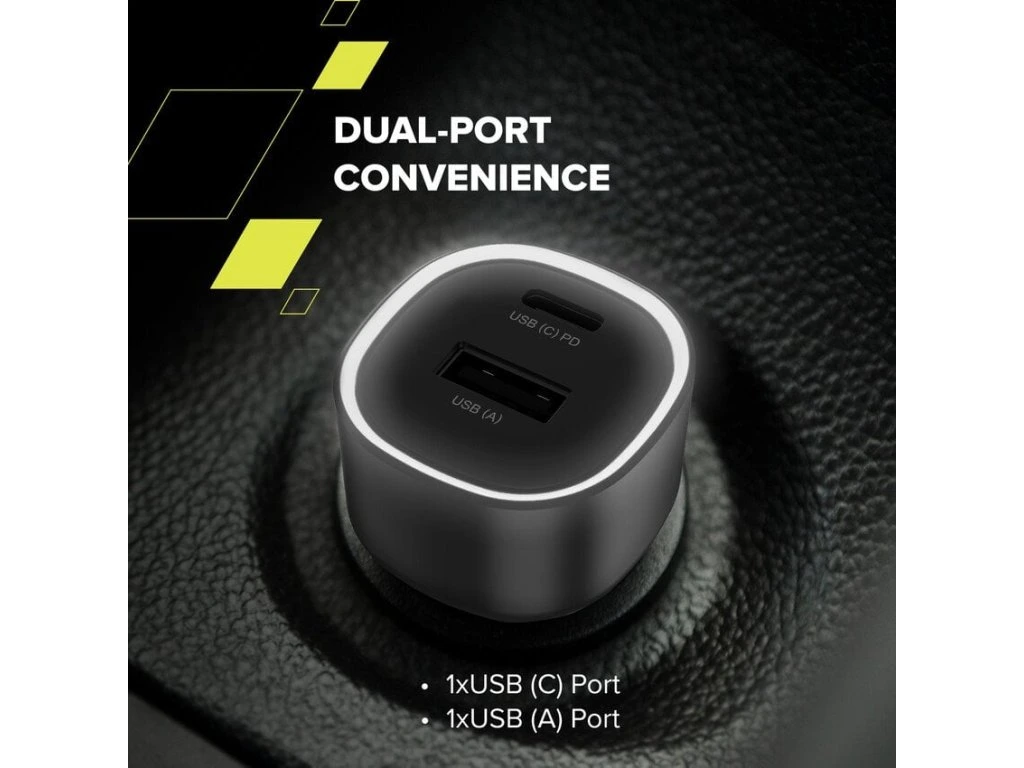 Nabíjačka ponúka port USB-C s rýchlym nabíjaním PD s výkonom až 30 W a port USB-A s výkonom 18 W a QC; ideálny pre telefóny, tablety, navigácie a ďalšie príslušenstvo.