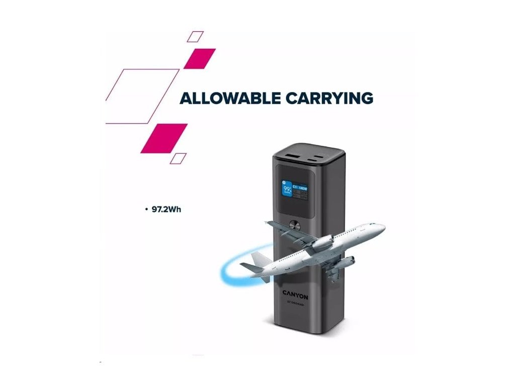 PRODUKTOVÉ VLASTNOSTI: Kapacita 27000 mAh Dva oboustranné porty USB-C PD3.1 Až 140 W pro nabíjení notebooku Výstupní port USB-A QC 3.0 Displej Povoleno v odbaveném zavazadle Tmavě šedé tělo Minimalistický design POWERBANKA PB-2010 Představujeme powerbanku Canyon PB-2010 - spolehlivé řešení pro všechny vaše potřeby nabíjení, ať už cestujete, pracujete na dálku nebo se věnujete outdoorovým aktivitám.Tato powerbanka se vyznačuje designem vhodným pro letecké společnosti. Má kapacitu 97,2 Wh, což je přesně pod hranicí 100 Wh, kterou lze bezpečně přepravovat v odbaveném zavazadle při cestování letadlem. Toto zařízení je vybaveno vysokorychlostními porty USB-C Power Delivery 3.1 a dokáže efektivně nabíjet notebooky a další zařízení rychlostí až 140 W. Tyto porty jsou obousměrné: lze je používat jako vstupní i výstupní. Spolu s výstupním portem USB-A QC 3.0 můžete bleskově nabíjet tři zařízení současně. Vestavěný displej vás informuje o zbývajícím výkonu v režimu nabíjení. Upgradujte na Canyon PB-2010 ještě dnes a zažijte pohodlí, které vám umožní zůstat nabitý kdekoli a kdykoli. VHODNÉ PRO LETECKÉ SPOLEČNOSTI Tato powerbanka je navržena tak, aby vyhovovala předpisům leteckých společností, takže je ideální pro cestování letadlem. S kapacitou 97,2 Wh je těsně pod limitem 100 Wh pro bezpečnou přepravu v odbaveném zavazadle. Vezměte si ji s sebou na cestu po celém světě bez obav z bezpečnostních omezení. VELKÁ KAPACITA Díky obrovské kapacitě 27000 mAh můžete mít všechna svá zařízení nabitá a připravená k akci. Nemusíte se bát, že zmeškáte důležitý pracovní hovor nebo ztratíte kontakt se svými blízkými. OBOUSMĚRNÉ RYCHLÉ NABÍJENÍ Oba porty Type-C mohou rychle nabíjet vaše zařízení a zajišťují rychlé nabíjení samotné powerbanky. To vše při maximální rychlosti 140 W podle standardů protokolu Power Delivery 3.1. To je více než dostatečné pro většinu zařízení, včetně špičkových notebooků. SOUČASNÉ NABÍJENÍ Tři výstupní porty umožňují nabíjet tři zařízení najednou. Nabíjejte notebook, telefon i fotoaparát najednou. DISPLEJ Informativní TFT displej poskytuje komplexní údaje o režimech nabíjení a používaných portech, jakož i o zbývající energii. SPECIFIKACE Barva: Tmavě šedá Maximální výstupní výkon: 140 w Kapacita baterie: 27000 miliampérhodina Maximum Output Current: 5 ampér Napájecí adaptér a funkce napájecího zdroje: LCD Display Battery Cell Quantity: 6 Záruční podmínky: 24 měsíců Název marketingového modelu: PB-2010 Obchodní název: Power bank Canyon PB-2010 TFT 27000 mAh 97.2Wh PD140W QC 3.0 Dark Grey (CNE-CPB2010DG) Power Output: 1 (USB Type-A) Power In/Out: 2 (USB Type C) USB typu A1: DC 5-12V 3A22.5w USB Type C1, USB Type C2: DC 5/9/12/15/20/28V 5A140w DC 5/9/12/15/20/28V 5A140wDodatočné parametre