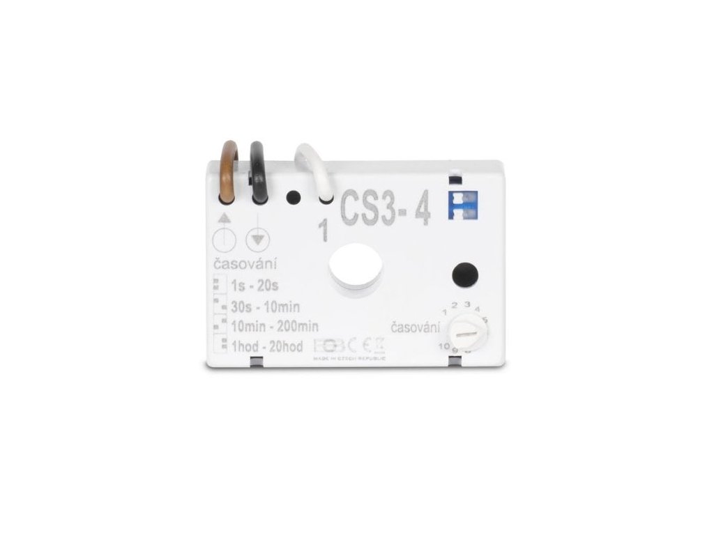 Funkcia CS3-4: je určený na opoždené vypínanie odporových alebo induktívnych záťaží - ventilátorov. K zapnutiu dojde okamžite po stlačení tlačidla, ale samotné časovanie sa spustí po uvolnení tlačidla. Technické parametre Napájanie 230, 0 V / 50 Hz Typ montáže pod spínač Montáž bez nulového vodiča Áno Odporové zaťaženie 5 W až 150 W Indukčná záťaž 5 VA až 50 VA Príkon 0,500000000 W Spínací prvok triak Nastaviteľný čas 1 s 520 mm) Stupeň ochrany IP20 Prevádzková teplota 0 °C až 50 °CDodatočné parametre