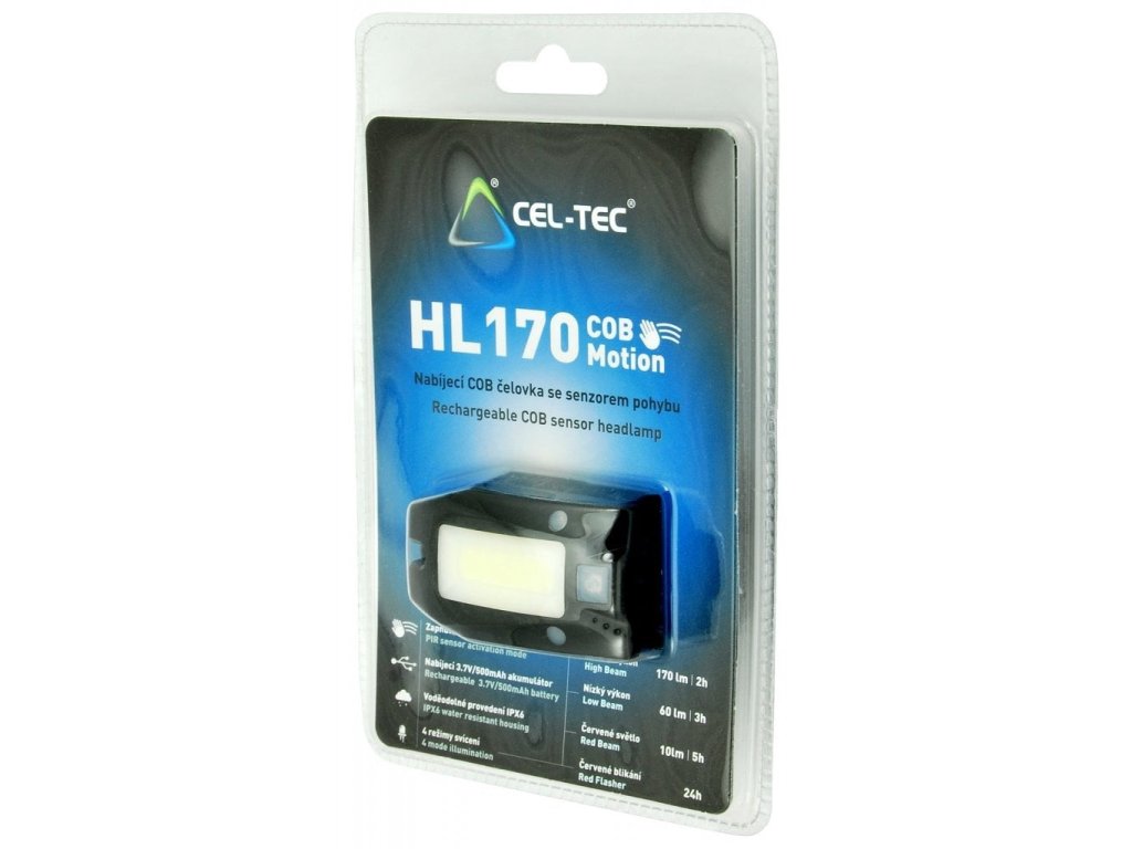 Multifunkčná dobíjacia baterka CEL-TEC HL170 COB Motion je profesionálny výrobok s dlhou životnosťou a COB LED. Hlavné vlastnosti: -Profesionálny výrobok s dlhou životnosťou a COB (Chip on board) LED - LED čipový pásik -Zapnutie/vypnutie mávnutím ruky -vodotesné prevedenie IPX6 -4 režimy osvetlenia -Univerzálne zariadenie: čelovka a kapesná baterka v jednom -Malé rozmery sú výhodou pri práci v stiesne - akrylové sklo so 100% odrazivosťou -Nabíjateľná lithium-iónová batéria 500 mAh, 3,7 V -Batéria je chránená proti prebitiu a hlbokému podbitiu -Čas nabíjania približne 3-4 hodiny -Vrátane klipu na opasok - Výdrž - Výdrž - Výdrž - 1 11 m Nízka - 60 lm - 3 h - 7 m Červená - 10 lm - 5 h - / Červené blikanie - / - 24 h - / Parametre Kontrola detekcie pohybu - mávnutie rúk: Áno Materiál čočky: PMMA (polymetylmetakrylát) - akrylové sklo so 10 3,7 V: Li-ion s ochranou proti prebitiu a hlbokému podbitiu. Čas nabíjania: približne 3 hod. Svetelný tok: max170lm (2h) / nízky 60lm (3h) / červený 10lm (5h) / červené blikanie (24h) LED: COB (Chip on board) čipový pásik Dodávané príslušenstvo: klip na opasok alebo klip na hľadáčik, popruh 90 g Hmotnosť čelovky (svetlo + remienok): 46 g Rozmery balenia: 11,5x 18x 4,5 cm Rozmery samotného svetla: š 60 mm x 33 mm x 12 mm Rozmery svetla s držiakom: š 70 mm x 33 mm x 25 mmDodatočné parametre